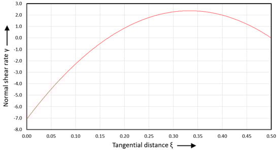 Figure 10 shows the tangential flow rate for several values of the flow rate . The blue curve with a dashed line (F = 0.50) becomes the flow rate curve at the flow centerline for the square channel. The tangential shear rate along the flow centerline is found by taking the first derivative of the tangential velocity. This leads to