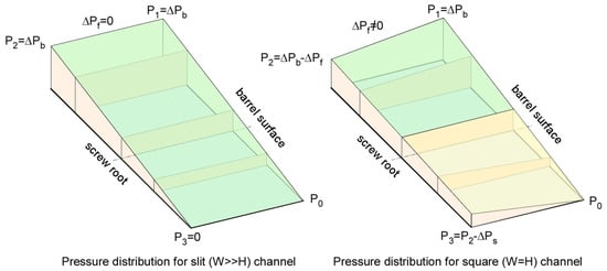 Figure 18 shows qualitatively the pressure distribution for a slit channel (left) and a square channel (right). In slit flow, the pressure drop at the flight flanks is negligible relative to the pressure increase along the barrel. As a result, the increase in pressure along the barrel equals the pressure drop along the root of the screw , see Figure 18 left.