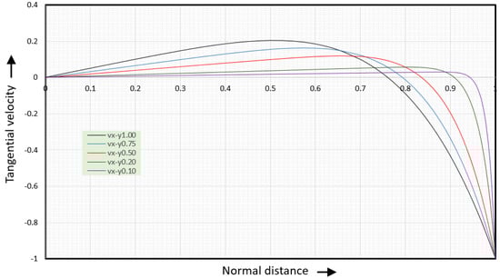 This is the dimensionless form of Equation (6) for the tangential velocity . Figure 9 shows the tangential velocity versus normal distance.