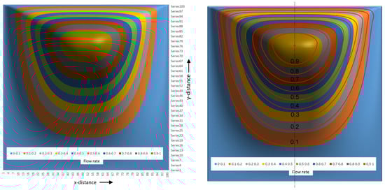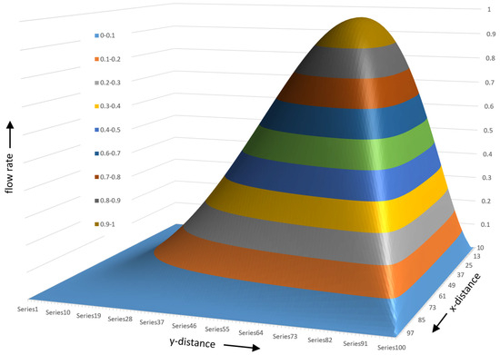 Flow rates and velocities have been displayed with 3D surface plots and contour plots. These plots provide better insight into the flow behavior than 2D graphs and allow for detailed examination of the flow characteristics. We analyzed flow in a slit channel where the width is much greater than the height (). We also analyzed flow in a square channel ().