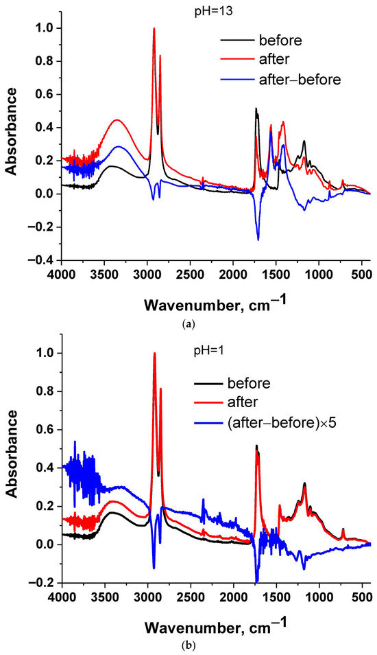 In Figure 2 the FTIR spectra of cutin before and after immersion in water of various pH values for 24 h are presented. Along with the raw spectra, the subtracted spectrum is presented, which facilitates tracking the differences between the samples before and after the immersion. Spectra subtraction is a suitable method for detecting differences between samples [29]. As can be seen in the subtracted spectra (Figure 2a), at pH = 13 a negative peak is present at around 1730 cm−1 which is assigned to ester C=O stretching [29]. A positive broad peak at around 3400 cm−1 is also present, which is assigned to O-H stretching [29]. These suggest a decrease in ester bonds and an increase in OH groups. Both of these can be explained in terms of (partial) hydrolysis of cutin. For other pH values (Figure 2b,c) similar conclusions can be extracted, but the differences are smaller; e.g., for pH = 1 the differences are more evident if the subtracted spectrum is multiplied by a factor of 5. These are in agreement with optical observations of the water after the immersion. Specifically, the water with pH = 13 exhibited a slight yellow-brown color, which can be explained in terms of a higher degree of hydrolysis and thus higher migration and solubilization in water of some low molecular weight fragments. Thus, it seems that at higher pH values, hydrolysis is more extensive (in accordance also with the methods described for cutin extraction), but it occurs to a smaller extent at lower pH values as well. In Figure 2d, all four spectra are presented. It can be seen that only in the case of the sample immersed in water of pH = 13 can considerable changes be observed. All other spectra seem similar; however, as discussed above, by spectrum subtraction, some minor changes can be detected.