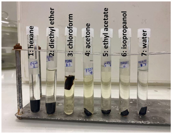 Since water alters the chemical structure of cutin during swelling, as mentioned above, the % swelling in water and the % swelling in the other solvents will not correspond to the exact same structure. Thus, although the % degree of swelling of cutin membranes immersed in water was minimal (≈10%), it was decided to exclude water from the calculations. In Table 1, the % swelling of cutin films in various solvents is presented. Photos of the swollen samples inside the solvents are presented in Figure 3. As can be seen, chloroform appears to be the best solvent since it causes by far the highest swelling (Table 1). Also, as can be seen in Figure 3, chloroform (solvent 3) exhibited the darker color at the end of the swelling experiments. Other low-medium polarity solvents like diethyl ether, acetone and ethyl acetate can adequately swell cutin to an extent in the range of 50–60%. The nonpolar solvent hexane causes a minimum swelling of 10–20%, suggesting that hexane is a poor solvent for cutin and weak interactions exist between the two. For this reason, the Ra of hexane was used as the Ro value for the calculation of RED as mentioned in Section 3.2. In other words, if the RED value of a substance is higher than 1, this means that the interactions with cutin will be even poorer than the ones of hexane. Thus, very poor interactions would be expected with cutin and thus minimum migration.