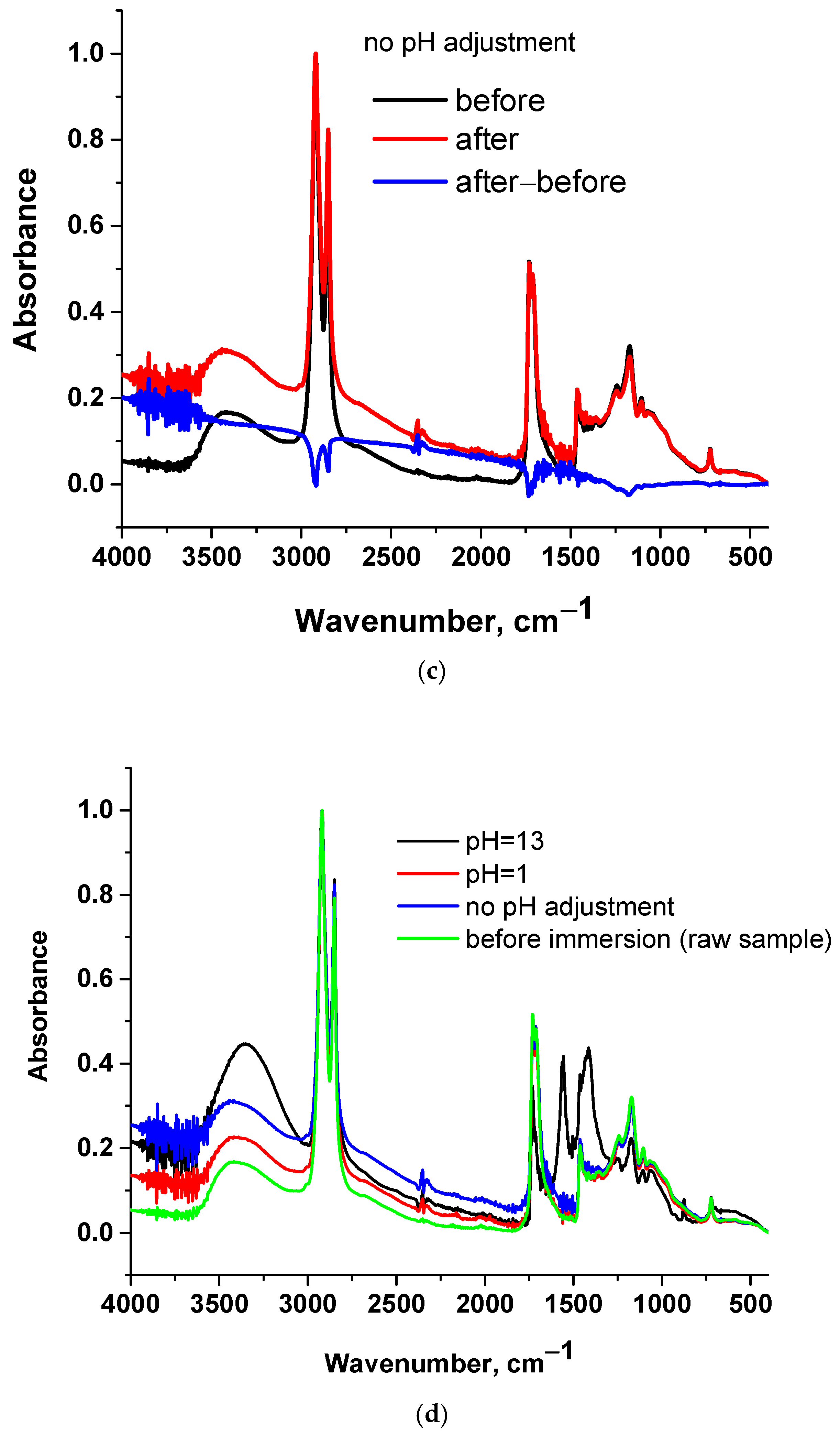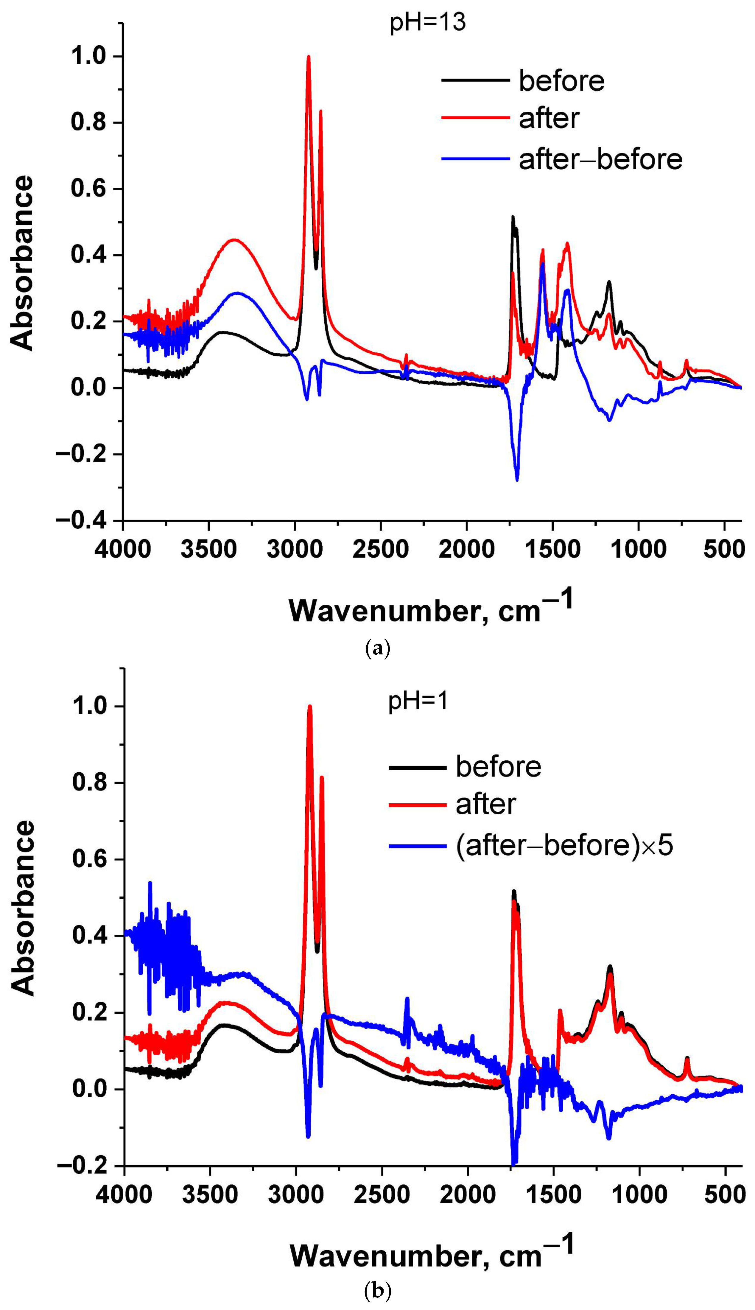 In order to examine the interactions of cutin with water, small pieces of cutin membranes (after polymerization) were immersed in excess of water of three different pH values: (a) one sample was immersed in water of pH = 1 adjusted by the addition of concentrated HCl acid solution, (b) one sample was immersed in water of pH = 13 adjusted by the addition of NaOH and (c) one sample was immersed in distilled water without any pH adjustment. After immersion for 24 h at room temperature, these samples were air-dried and along with a non-immersed cutin membrane sample, were examined by a Nicolet 380 Attenuated Total Reflectance Fourier Transform Infrared (ATR-FTIR, Waltham, MA, USA) spectrometer with a resolution of 4 cm−1 and 32 scans.