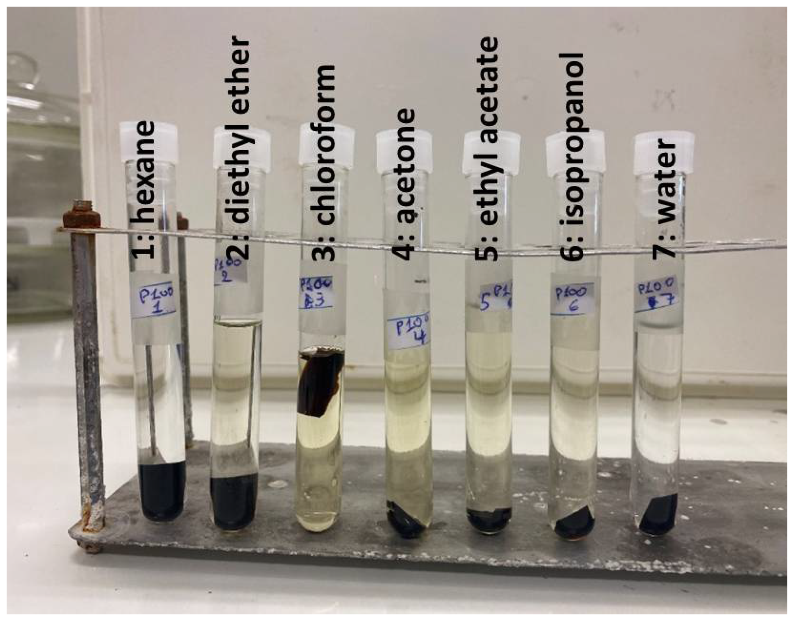 Diethyl ether, hexane, ethyl acetate, isopropanol, acetone, and chloroform were all of analytical grade purity purchased either from Carlo Erba Reagenti (Italy), Fisher Scientific (Germany), or Sigma-Aldrich Chemie GmbH (Germany).