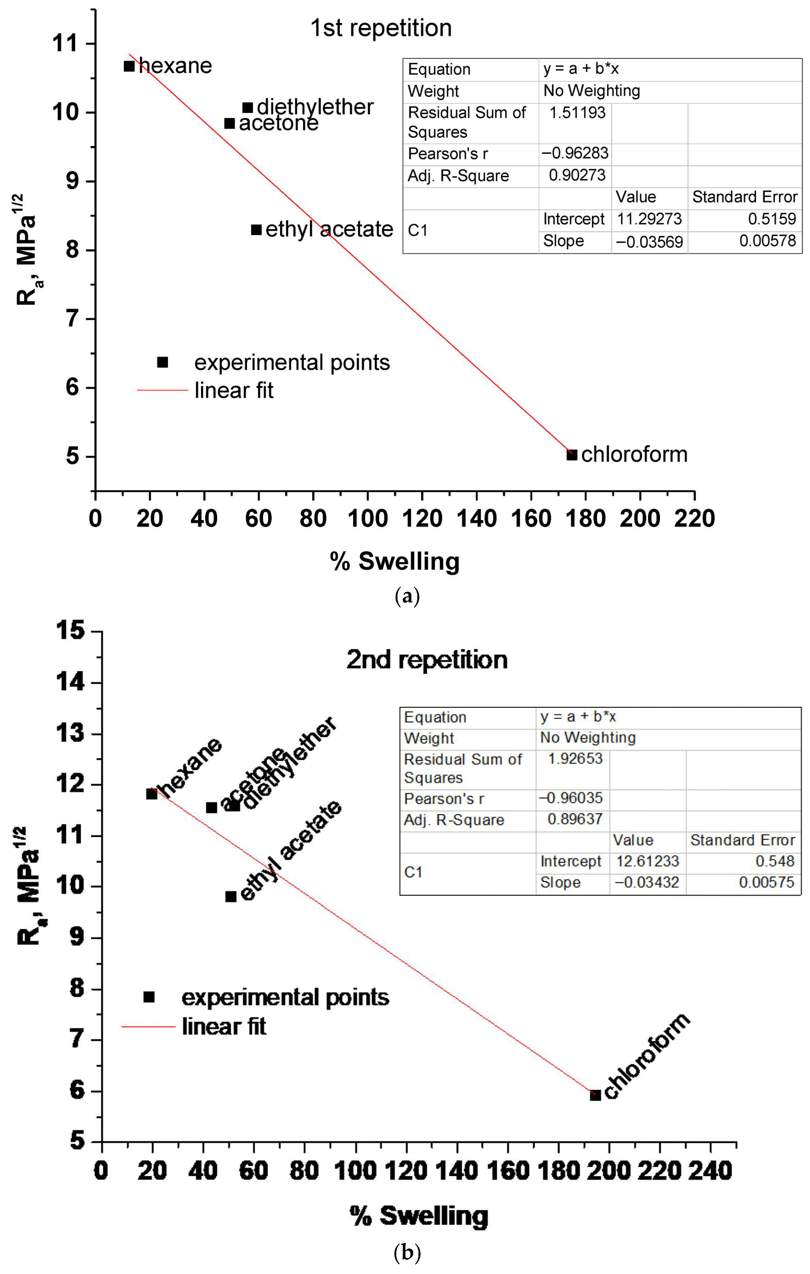 a values are plotted against the % degree of swelling, and then linear regression is performed and the R