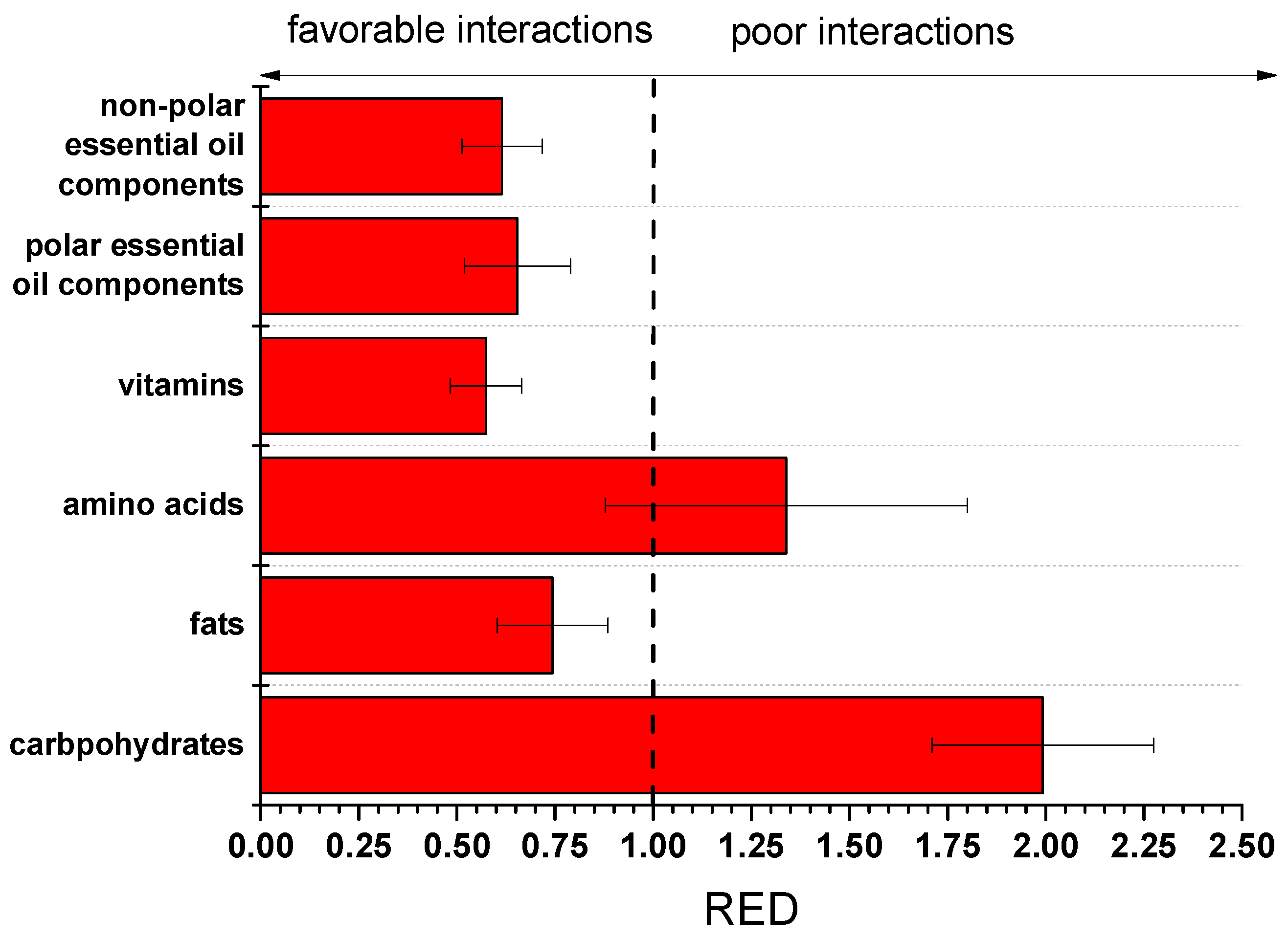 o value). By comparing the RED value with 1, it can be predicted with which group of substances cutin is likely to exhibit favorable interactions and compatibility. The existence of strong interactions suggests a high probability of migration and/or permeation.
