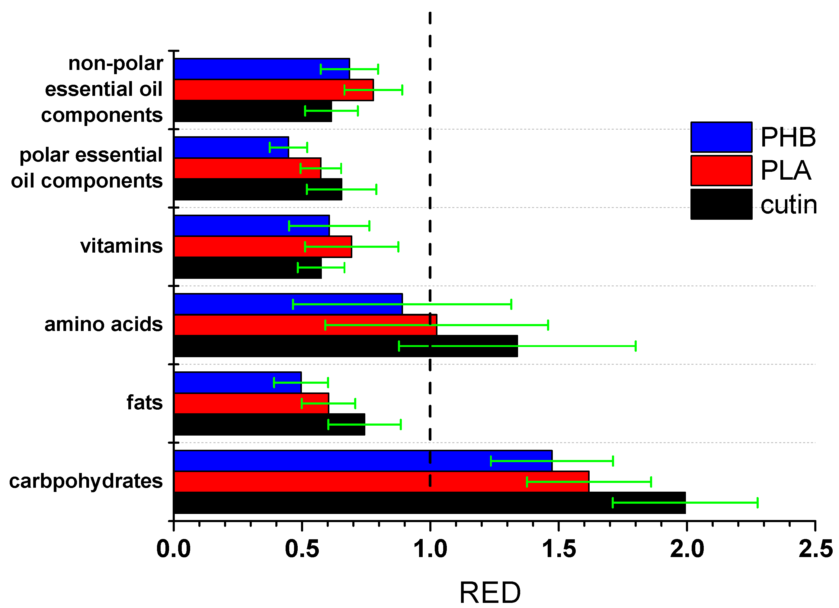 As can be seen, cutin exhibits lower average RED values (better compatibility) with non-polar essential oil components and marginally lower with vitamins. This is rather expected due to the low value of cutin’s δp. However, for all other food component categories the average RED values of cutin are higher than the ones of the other polyesters. The error bars are rather high and cause a partial overlapping in some cases. These error bars arise from the standard deviation of the HSP of each group. Nevertheless, the average values clearly suggest a trend. Thus, it seems that cutin is less susceptible to migration than other bio-based polyesters.