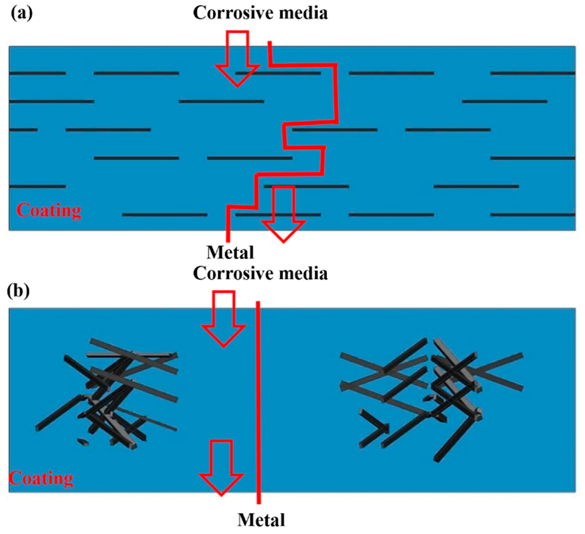 | Physical Barrier | GO nanosheets form a tortuous maze barrier | Extends the Cl− penetration path by >10 times | GO dispersion, orientation, interlayer spacing |