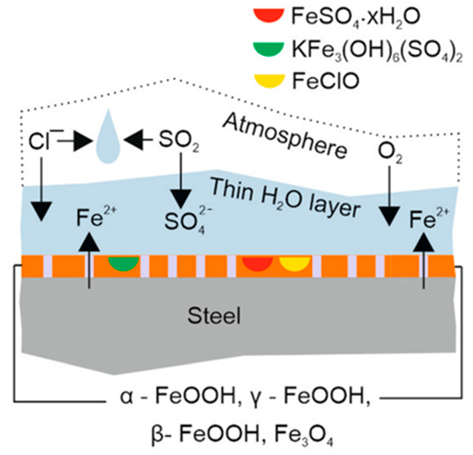 - Seechurn, Y.; Surnam, B.Y.R.; Wharton, J.A. Marine atmospheric corrosion of carbon steel in the tropical microclimate of Port Louis. Mater. Corros.-Werkst. Korros. 2022, 73, 1474–1489. [Google Scholar] [CrossRef]