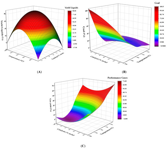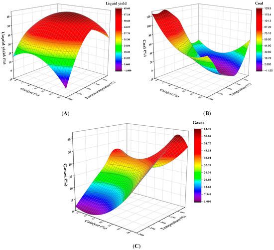 Response surface for the effect of temperature and catalyst concentration on the yield of (A) liquids, (B) solid carbonaceous residue, and (C) gases in PP pyrolysis.