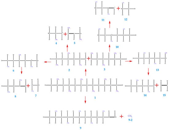 Figure 5 shows the proposed reaction mechanism for the thermal degradation of polypropylene (PP), emphasizing the formation of reactive intermediates. In this process, the cleavage of C–C bonds takes place under high temperatures, leading to the generation of gaseous and liquid products. The radical intermediates were modeled at critical temperatures of 500 °C and 550 °C to evaluate their energetic and structural behavior. The analysis of the system’s energy characteristics (E. System) in the 450–550 °C range reveals values that remain essentially unchanged (≈−3.09 × 10−12 J). At 450 °C and 1 atm, the energy is −3.09 × 10−12 J, and at 550 °C, it remains practically the same. This minimal variation indicates that, within this temperature window, the degradation process of PP does not involve significant differences in overall system stability (Table 11 and Table 12).