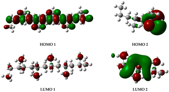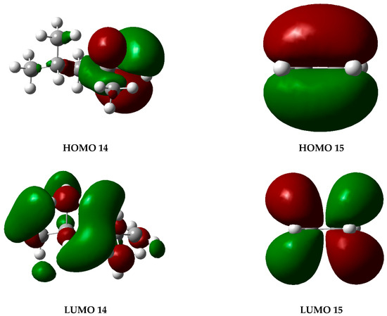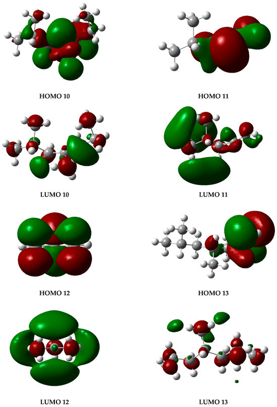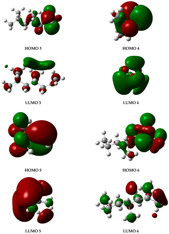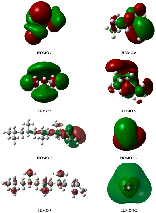 The graphs presented in Figure 6 illustrate the molecular orbitals of PP at 450 °C, obtained through optimization and frequency calculations. These images depict the electron distribution in the HOMO and LUMO orbitals of the fragments generated during the pyrolysis process, as proposed in the mechanism shown in Figure 5. The HOMO represents the highest-energy orbital, containing the principal electrons, while the LUMO remains unoccupied and constitutes the optimal site for electron excitation.