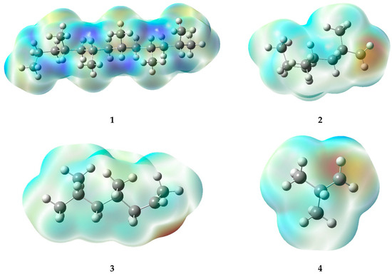 A computational study on the thermal decomposition of PP was performed using the B3LYP/6-311G (d,p) computational level [32]. Tests were conducted under different conditions to analyze their effect on pyrolysis. Four fundamental temperatures were considered for the evaluation: 25.0 °C, 450.0 °C, 500.0 °C, and 550.0 °C. Each of these temperatures was evaluated under three pressures: 1 atm, 10 atm, and 20 atm, to understand the behavior of PP under various temperature and pressure conditions. Particular attention was given to the HOMO and LUMO orbitals (Highest Occupied Molecular Orbital and Lowest Unoccupied Molecular Orbital, respectively), since these are essential to understand the reactivity of the produced fragments. Furthermore, electrostatic potential (EPM) maps corresponding to each relevant fragment were extracted during the pyrolysis process. These diagrams and maps were calculated for each optimized structure under the specified temperature and pressure conditions.