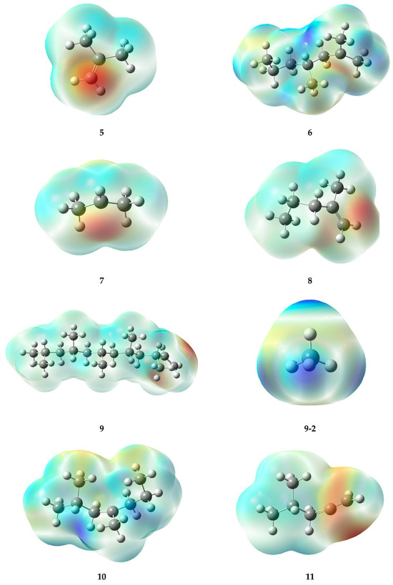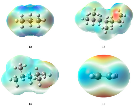 The high-temperature areas located at double bonds and radicals in electrostatic potential maps (EPMs) provide consistent information about the reactivity of the molecules (Figure 7). In the case of double bonds present in specific structures (5, 8, 11, and 15), the pi electrons generated in such bonds generate a higher electron density, leading to areas of positive charge on the carbon atoms involved in the bond. Consequently, hot regions (deep red or orange) are generated in the EPM, which demonstrate a remarkable reactivity, especially toward nucleophiles or compounds with high electron density.