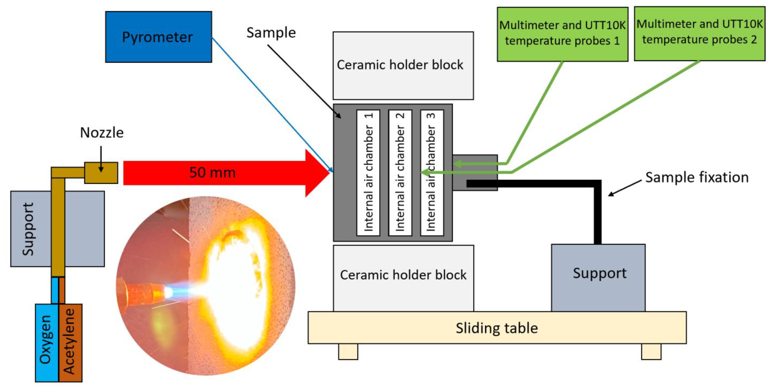 12]. A flame exposure apparatus, set up according to the American Society for Testing and Materials (ASTM) E 285-80 standard and validated via CFD simulations of oxygen–acetylene combustion, accurately predicted heat flux and surface temperatures, providing a benchmark for TPS material testing [
