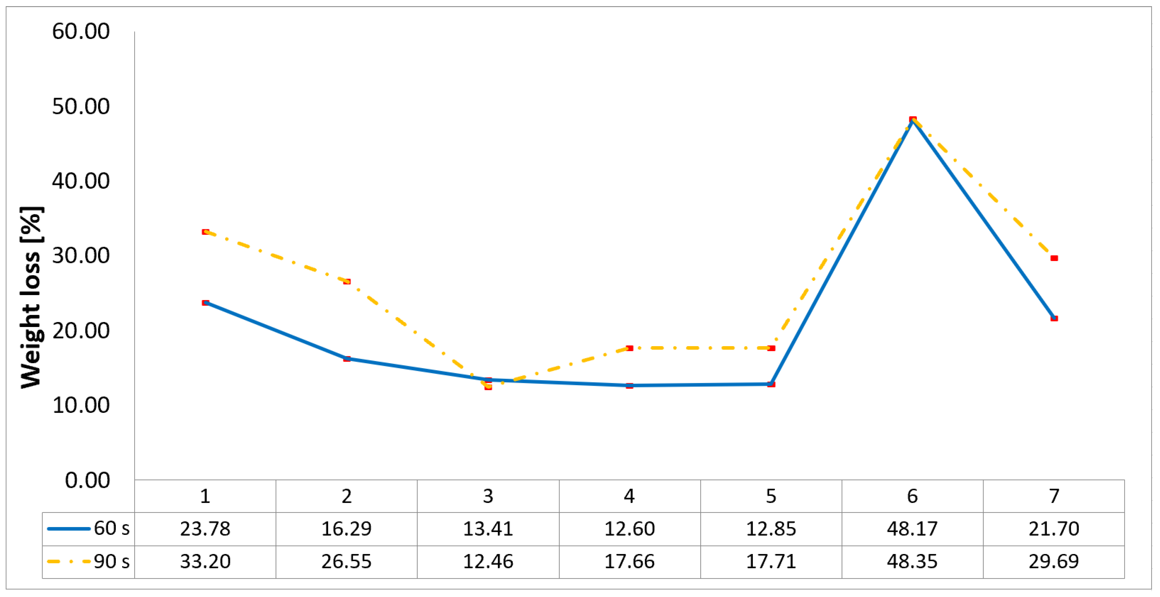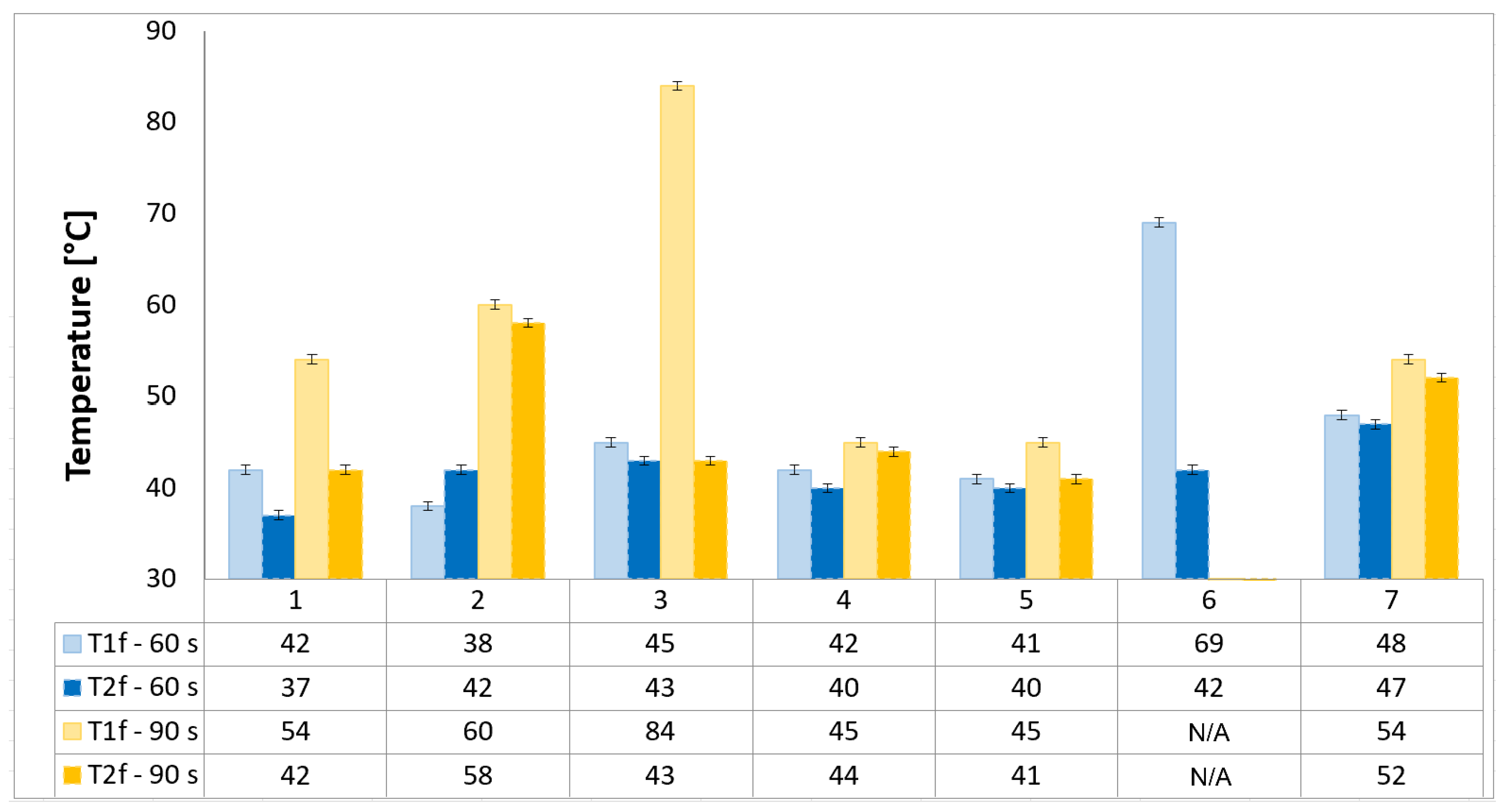 Lower temperatures on the back face of the probe (T1f and T2f) are desirable, as they indicate effective thermal protection. Probe 6 shows an extremely high temperature reading on its back face at the 60 s mark (69 °C). Probe 3 demonstrates a significant increase in temperature at the back face with this, for the 90 s exposure, jumping to 84 °C. This suggests that while it may perform well in shorter tests, its long-term insulating capacity is compromised.