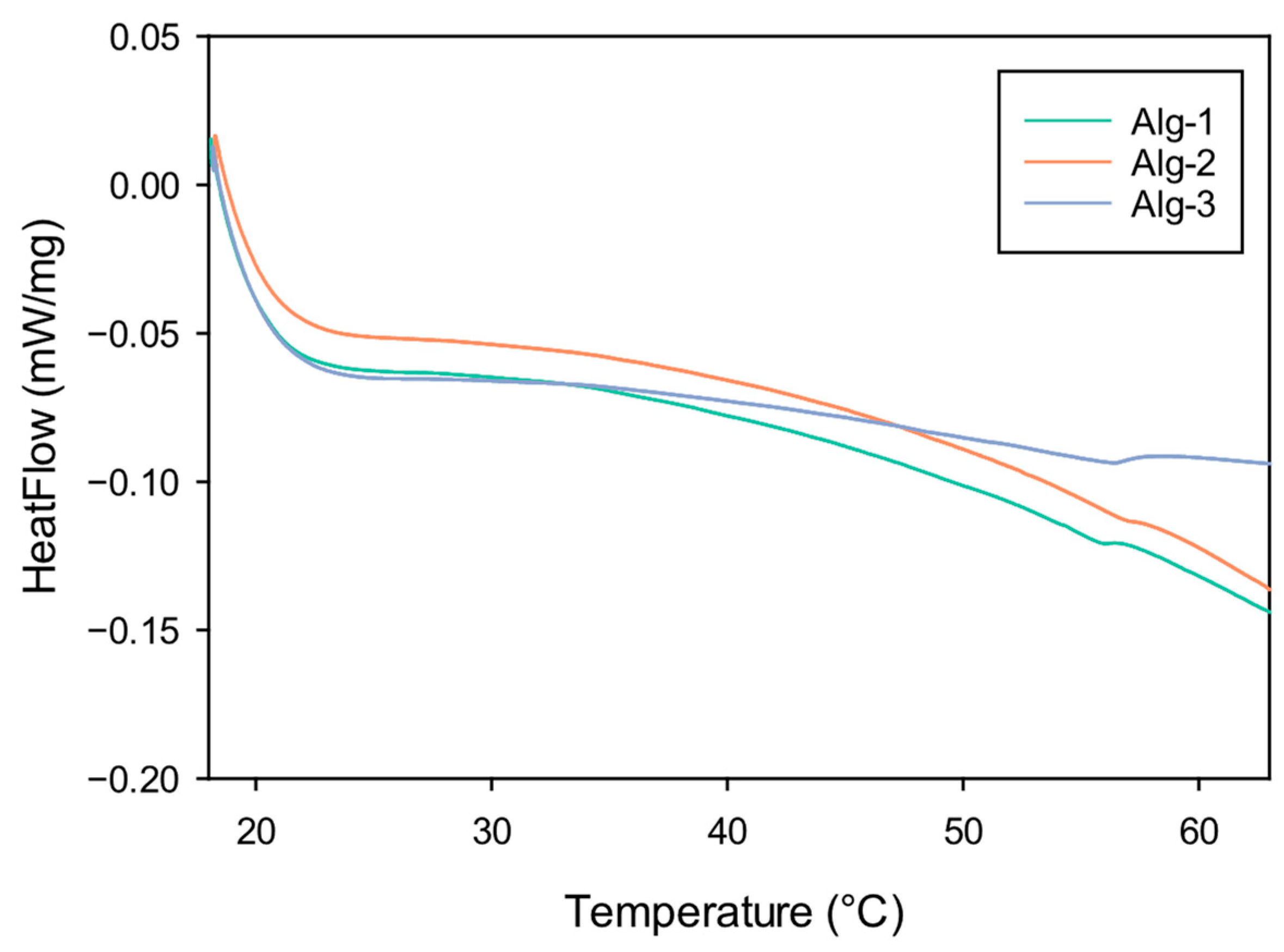 Differential Scanning Calorimetry (DSC): DSC measurements were carried out with a Q2000 calorimeter (TA Instruments, software thermal advantage rel. 5.5, New Castle, DE, USA) under N2 flux in Al open crucibles. Prior to analysis, samples were dehydrated under vacuum at room temperature for 24 h. The thermal protocol consisted of the following: (i) heating from 18 to 40 °C at 2 °C/min; (ii) an isothermal step at 40 °C for 30 min to remove residual atmospheric moisture; (iii) cooling from 40 to 16 °C at 5 °C/min; (iv) an isothermal stage at 16 °C for 60 min to stabilize the material; and (v) heating from 16 to 65 °C at 2 °C/min. The dehydration was deliberately limited to T ≤ 40 °C to prevent material degradation. Indeed, attempts performed at higher temperatures (above Tg) led to partial deterioration, as indicated by a brownish discoloration of the polymers. Three independent measurements were taken on each sample. The temperature accuracy of the instrument is ±0.1 °C, the precision is ±0.01 °C, and the calorimetric reproducibility is ±0.05%. DSC data were analyzed by the Universal Analysis 2000 v 4.5 software by TA Instruments.