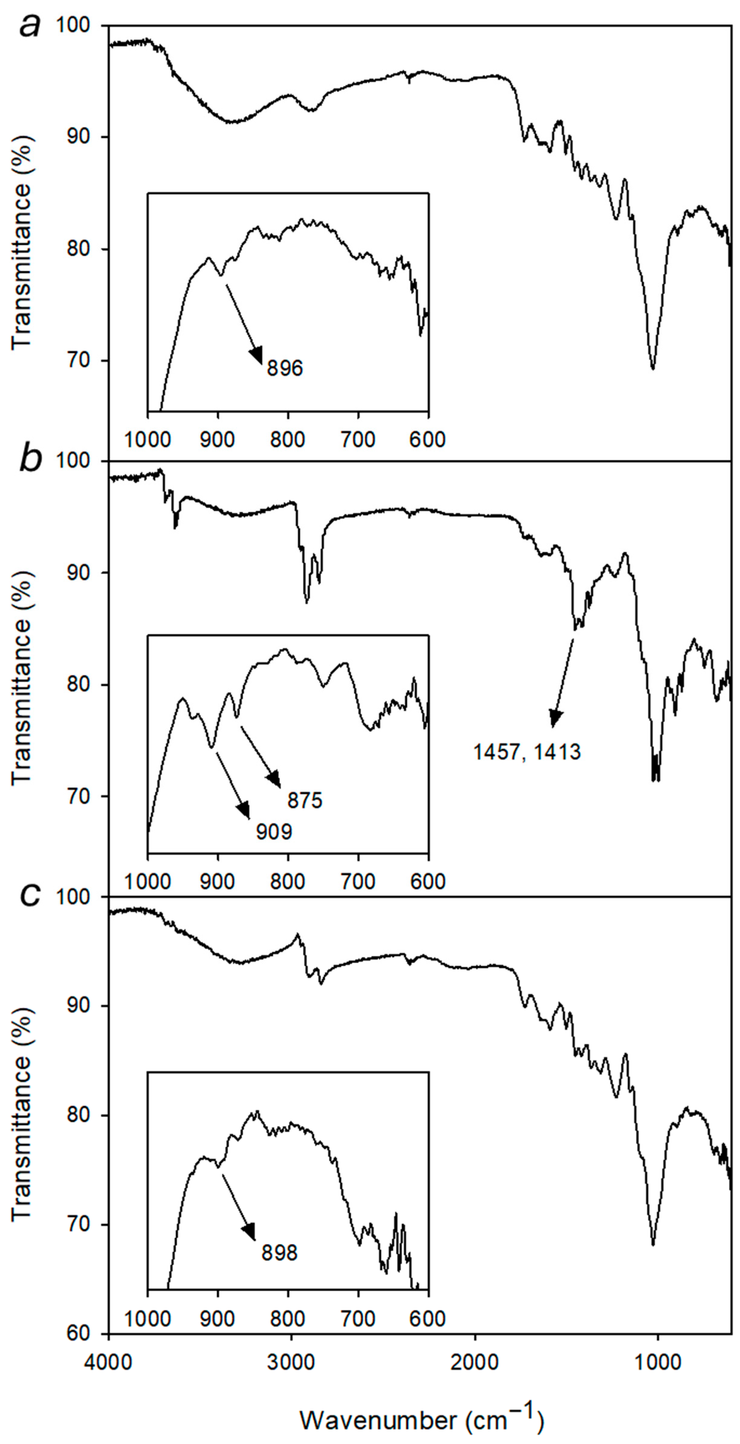 −1 is characteristic of Si–O stretching in silicates and is partially overlapped on the C-O-C band observed in the substrate spectrum. The new peaks that appeared in the 1000–600 cm
