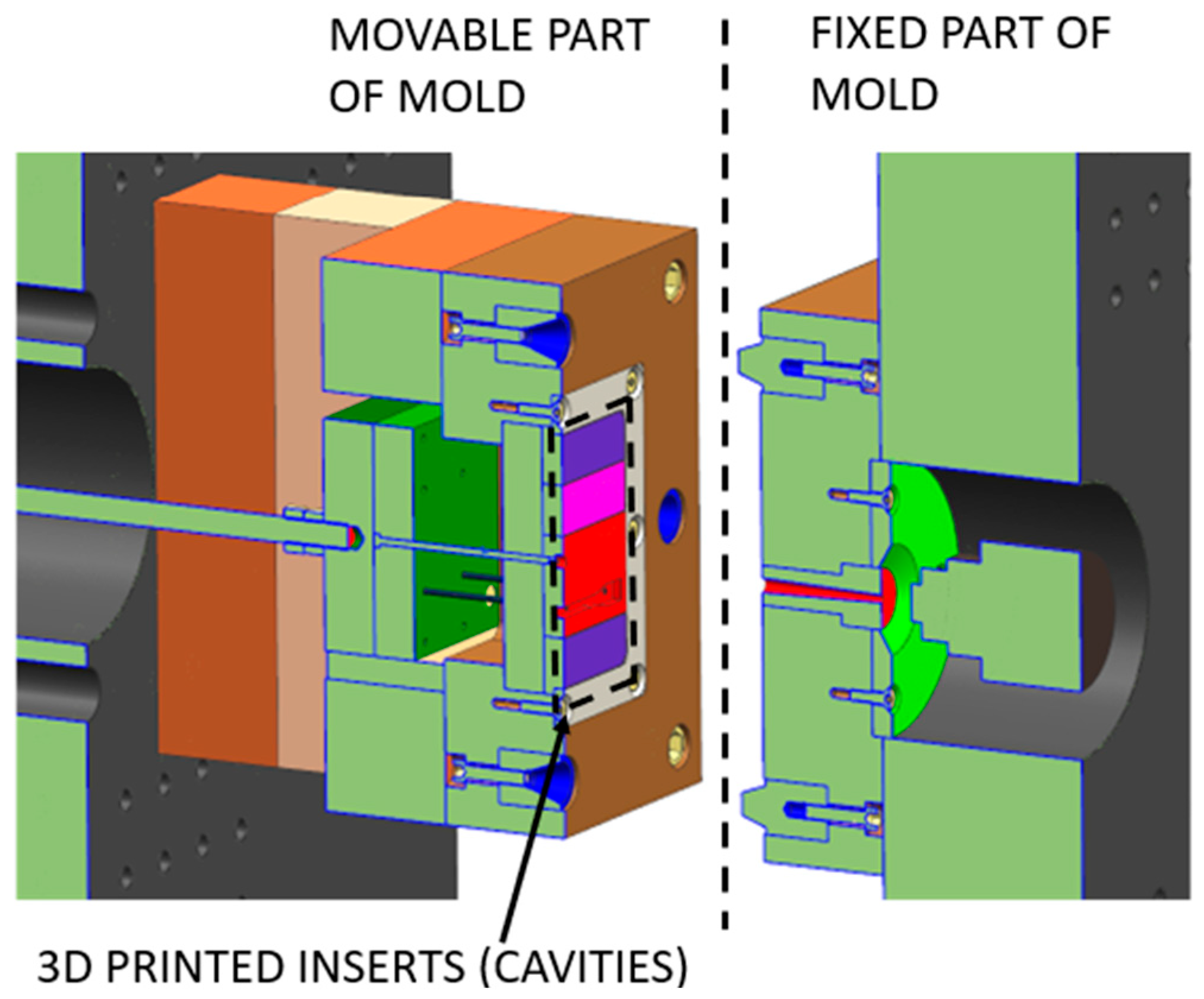 - Raz, K.; Chval, Z.; Milsimerova, A. Thermal specification of 3d printed injection moulds made from pa12gb. IOP Conf. Ser. Mater. Sci. Eng. 2021, 1199, 012009. [Google Scholar] [CrossRef]