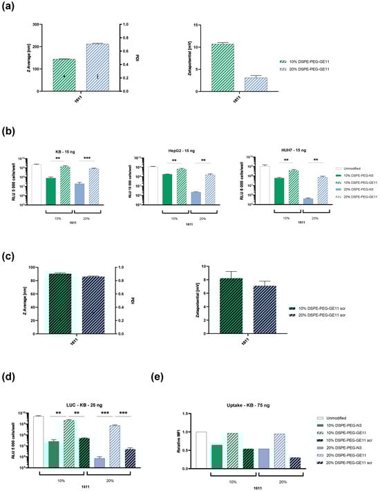Three EGFR-expressing cell lines HEPG2, HUH7, and KB were selected to assess the transfection efficiency of GE11-functionalized 1611 LAF-XP polyplexes. Unmodified, shielded (10% and 20% DSPE-PEG-N3), and targeted (10% and 20% DSPE-PEG-GE11) formulations were evaluated. Shielded 1611 exhibited lower transfection efficiency, which was restored by GE11 functionalization (Figure 2b).