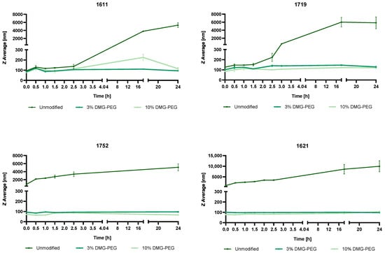 As expected, unmodified 1752 and 1621 aggregated at N/P 12. The incorporation of low molar amounts of DMG-PEG led to the formation of small and stable particles with low PDIs and successfully prevented aggregation (Figure S9).