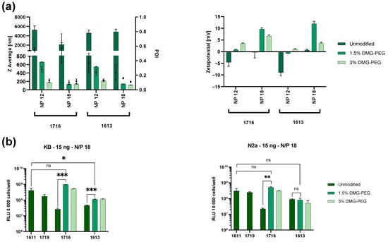 Encouraged by the successful reduction in the N/P ratio in 1752 and 1621, we hypothesized that the PEGylation strategy can be applied to carriers that previously could not be formulated. Thalmayr et al. reported that carriers 1716 and 1613 failed to form stable particles due to severe aggregation []. Structurally, 1716 and 1613 are highly similar. Both contain 12Oc as their LAF unit and have nearly identical molecular weights. They only differ in their topology. Carrier 1613 is a B2 bundle, while 1716 is a U4 U-shape. The combination of four LAF 12Oc motifs with a single Stp unit appears to result in highly unstable structures. However, both carriers were successfully formulated as LNPs, with 1716 demonstrating a particularly high transfection efficiency []. The carriers were PEGylated (1.5% and 3% DMG-PEG) at the N/P ratios of 12 and 18 (Figure 4a). At N/P 12, both unmodified carriers underwent aggregation. However, PEGylation significantly improved size and uniformity. It was found that 1.5% DMG-PEG successfully prevented aggregation, although it resulted in larger particles. Nevertheless, the formulations exhibited good uniformity with favorable PDIs. In addition, 3% DMG-PEG facilitated optimal particle formation for both 1613 and 1716. Notably, these formulations exhibited very low zeta potential, approaching near-neutral values. At N/P 18, both 1.5% and 3% DMG-PEG modification resulted in the formation of small particles with a low PDI and positive zeta potential.