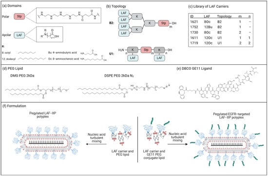 Our lab has recently developed double-pH-responsive lipo-amino fatty acid (LAF)-modified xenopeptide carriers (LAF-XPs) that undergo a lipophilic-to-hydrophilic polarity switch upon endosomal protonation [,]. LAF-XPs can be synthesized in a precise sequence-controlled manner using fmoc-based solid-phase-assisted peptide synthesis (SPPS). In this process, the polar artificial poly-amino acid succinoyl tetraethylene pentamine (Stp), introduced in properly tBoc protected form, is combined with apolar LAF units via bridging lysine units (Scheme 1a) in various different sequences, ratios, and topologies (Scheme 1b). Formulations with this novel carrier class present a sweet spot between cationic lipoplexes and polyplexes. The carriers share a certain similarity with classical cationic lipids used to form lipoplexes, but instead of a small polar head group they comprise a far larger ionizable polycationic polar domain. With 8 to >10 protonatable nitrogens, they are significantly smaller then commonly applied cationic polymers but display sufficient cationic charges and aqueous solubility to be employed for polyplex formulation []. With increased content of LAF units, they also can be used as ionizable lipids to formulate novel LNPs with exceptionally effective endosomal escape properties [,]. Formulation of LAF-XP carriers with RNA either as complexes or (in combination with helper lipids and cholesterol) as LNPs has shown exceptional transfection efficiency in vitro and in vivo [,,,].