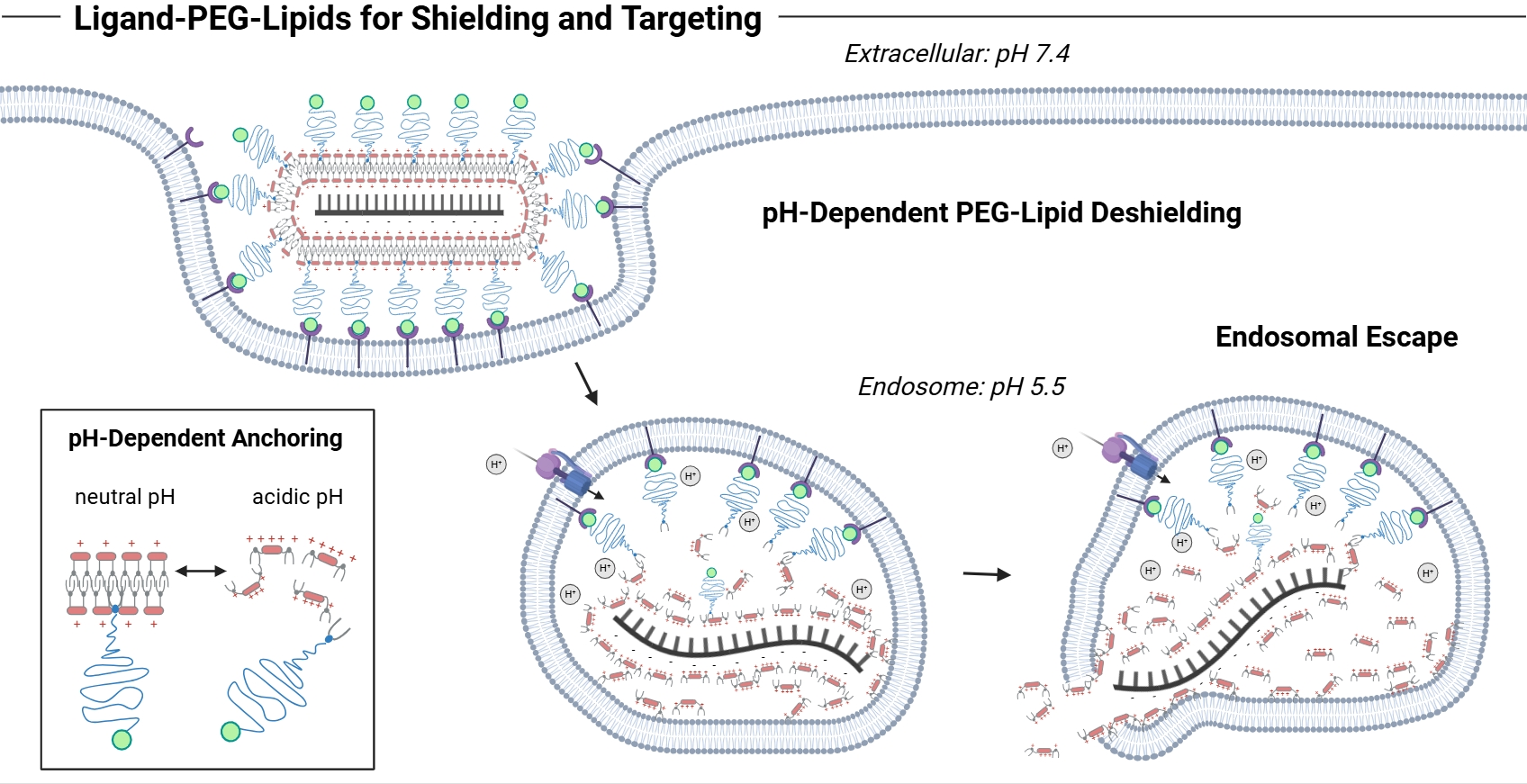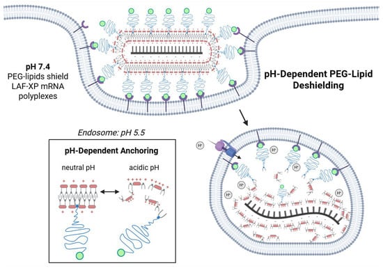 Hypothetical model of receptor-targeted delivery and endosomal deshielding. At physiological pH, the PEG lipids are well anchored within the hydrophobic LAF domains of the carriers and shield the LAF-XP mRNA polyplexes. Cell membrane interactions and subsequent uptake occur predominantly through ligand–receptor interactions. Endosomal acidification leads to the protonation of the LAF domain, resulting in a polarity shift, solubilization of the nanoparticle and dissociation of PEG lipids from the polyplex. As a result, interactions of the LAF carriers with the endosomal membrane are restored, enhancing endosomal escape.