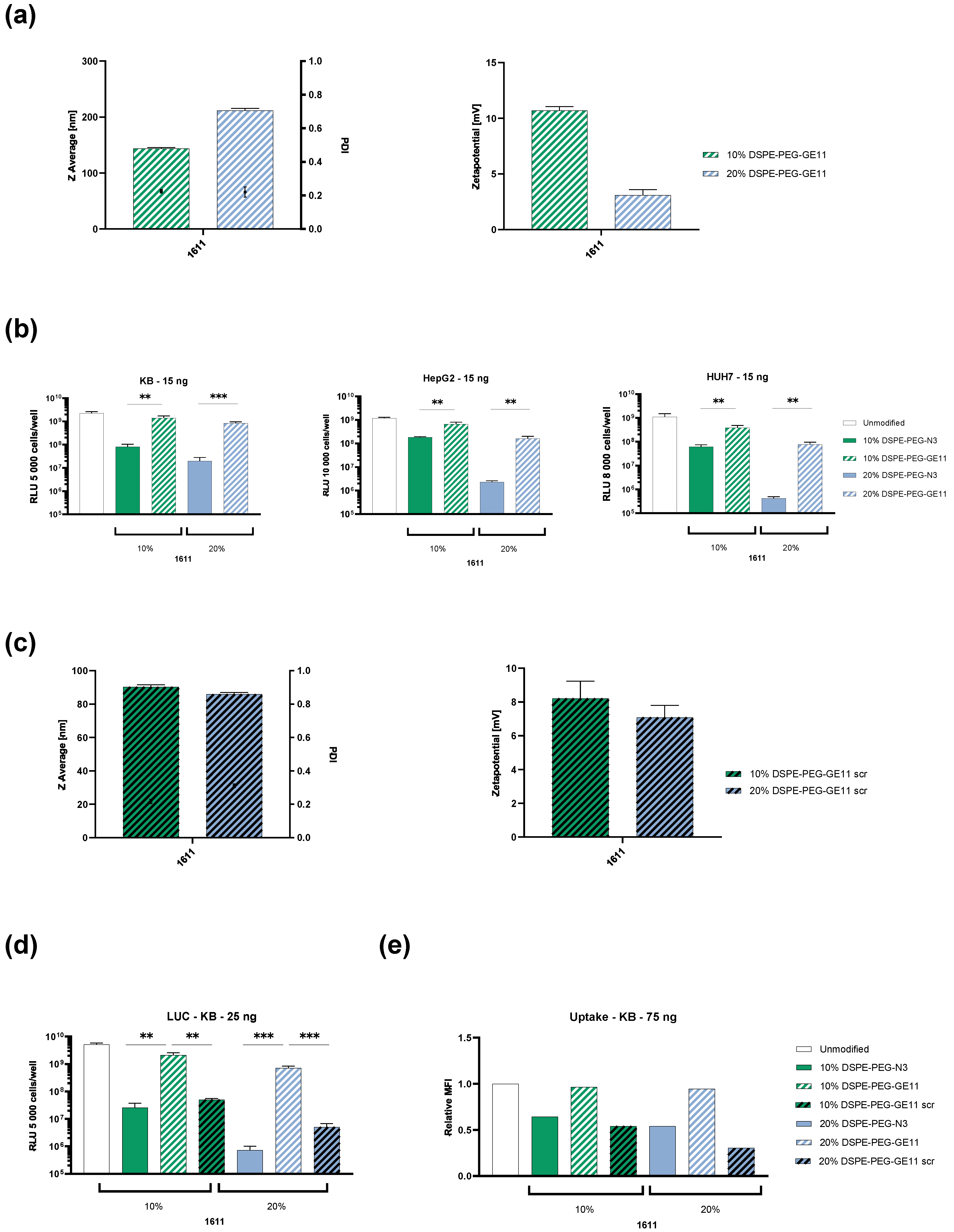 3.3. PEGylation and GE11 Targeting of LAF-XP pDNA Polyplexes