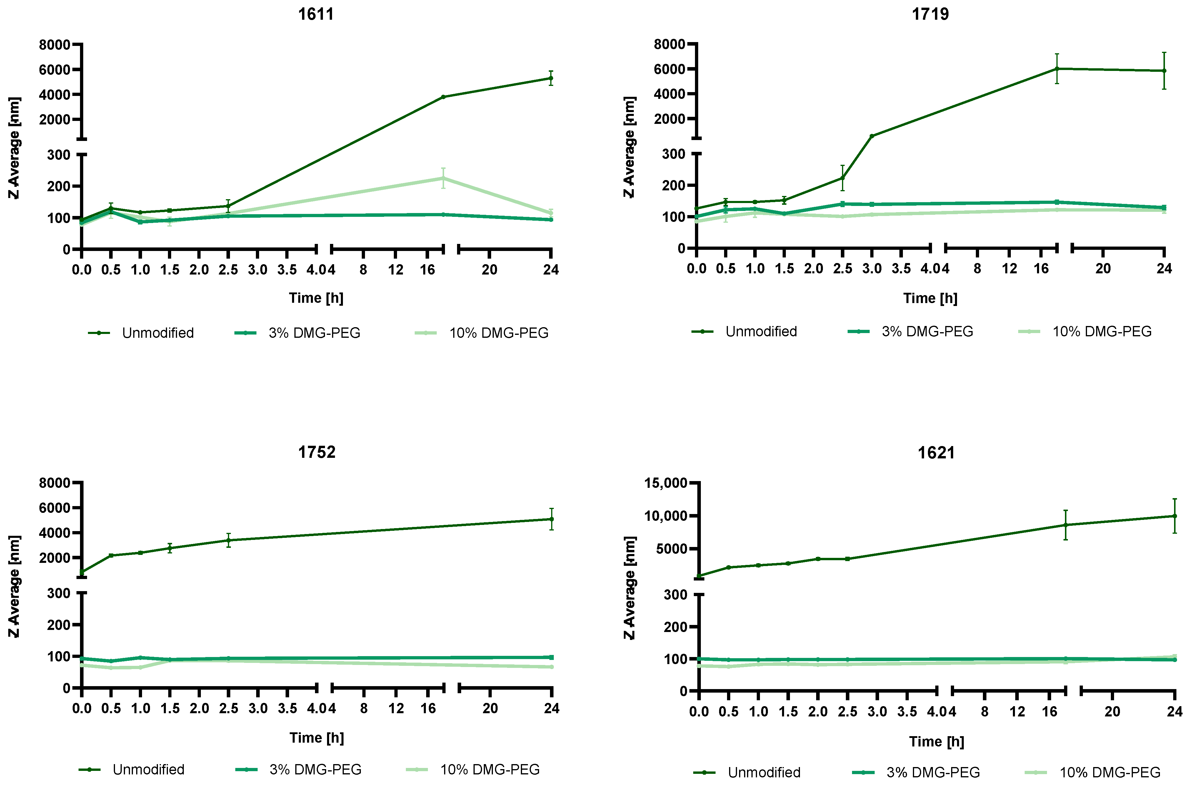 2.2.9. Steric Stabilization of LAF-XP mRNA Polyplexes Against Salt-Induced Aggregation Through PEGylation