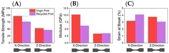 The functional and mechanical performance in printed parts was measured in both virgin and recycled prints (Figure 2, Table S1). Tensile testing is commonly used in the research literature as a way to measure the mechanical performance of virgin and recycled composites manfuactured using LFAM [,,]. As can be seen, a significant reduction in the average X-direction (direction of the print) tensile strength (21%) in recycled samples was observed. However, no significant difference was calculated in the average Z-direction tensile strength. A significant reduction in the average tensile modulus in the X-direction (39%) was also observed. However, a significant increase in the modulus in the Z-direction was observed (4%). No significant change in the strain at the break in the X- or Z-directions was observed. The reduction in mechanical properties with recycling, as evidenced by the X-direction samples in Figure 2A, is not surprising based on the previous literature, which indicates a propensity for fiber breakage during mechanical recycling []; however, the minor yet significant increase in Z-direction modulus with recycling seen in Figure 2B is surprising. The previous literature has shown that while the load-bearing fiber breakage can reduce mechanical performance, it is also likely to produce print beads with lower surface roughness, potentially allowing for minimized interstitial porosity between the print beads and some mechanical property retention []. Previous research has shown that functional performance in the X-direction in LFAM parts is due to an increased propensity for fiber alignment in the printing direction due to shear forces within the nozzle []. This dataset supports this claim as when visualizing the surface of fractured samples using SEM (Figure S3), it was clear to see evidence of fiber pull-out in the X-direction samples. In the Z-direction, there appears to be less evidence of fiber pull-out and instead fibers appear to have an increased propensity for alignment in the direction transverse to the image plane. No other clear differences are observed between virgin and recycled samples. However, in addition to causing fiber attrition, mechanical recycling can cause reduction in both density (increased porosity) and resin molecular weight (chain scission) [].
