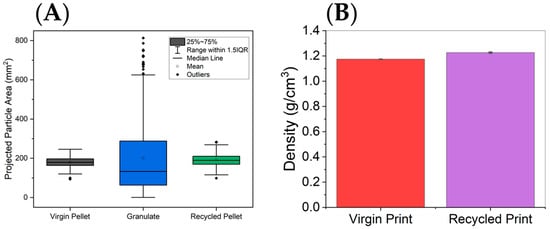 It is understood that changes in input particle size in 3D printing can contribute to changes in resulting print density and, thus, mechanical properties []. To understand whether input particle size/shape had any impacts on printed material density, particle size analysis was performed on virgin pellets, recycled granulate, and recycled pellet samples, and pycnometry was run on printed samples using both virgin pellets and recycled pellets (Figure 3). Images of the samples can be visualized in Figure S4. The resulting granulate samples present a significant particle size variation, with an increased propensity for smaller particles on average as compared to pellet samples. The distribution of the granulate sample is consistent with the previous literature, where a screen-based shredding system results in particles whose maximum particle size can be controlled by the screen/sieve used, but this process results in significant dust (or small-size particles) generation []. From this, a broad particle size is expected. However, no significant difference was calculated between the virgin and recycled pellet samples. This result is unsurprising but does confirm that both the virgin and recycled pellets have a similar shape (length and thickness) when processed under the same conditions. However, when these pellets were printed into parts and then analyzed by pycnometry, recycled print samples had a surprising significant increase in average apparent density as compared to virgin print samples (Figure 3B).