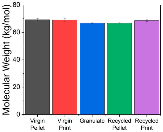 Mechanical recycling can additionally cause chain scission in both the twin screw extrusion and re-manufacturing steps from thermomechanical shear in the screw/nozzle []. GPC was run to quantify the molecular weight at each step of the recycling process (Figure 4). As can be seen, although a reduction in the molecular weight of granulate and recycled pellets (p < 0.05) is observed, no significant difference in molecular weight between printed samples is observed. Thus, it is unlikely that changes in molecular weight contributed to the changes in the functional performance in the printed parts. This result is consistent with the previous literature [,].