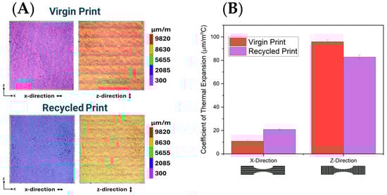(A) Localized thermal strain as measured using DIC analysis in both virgin and recycled samples in the X- and Z-directions and (B) bulk average CTE as measured by DMA in both virgin and recycled samples in X- and Z-directions.