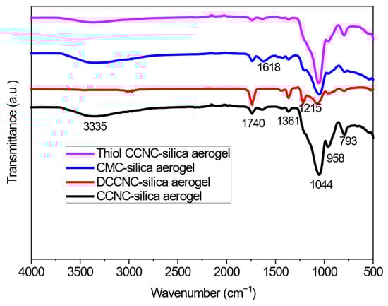 Figure 2 shows the FTIR spectra for CCNC-silica, DCCNC-silica, CMC-silica, and thiol-functionalized CCNC-silica aerogels. The broad O-H stretching band at ~3335 cm−1 was less intense in the CCNC-, DCCNC-, and thiol-CCNC-silica aerogels compared to their pure cellulose counterparts. This reduction is attributed to the formation of the silica network, which can form hydrogen bonds with cellulose hydroxyls, potentially altering the band’s characteristics, and to the dilution effect of the silica matrix. In contrast, the CMC-silica aerogel exhibited a more complex profile in this region. The extensive carboxymethylation of the cellulose backbone significantly alters its hydrogen-bonding network, which, combined with its interaction with silica, results in a distinct O-H band shape and intensity compared to the other aerogels. The FTIR analysis of all the aerogels showed a clear peak at 793 cm−1, which was caused by the stretching and bending vibration of the silanol group (Si-OH) []. Also, peaks at 1361 cm−1, 1215 cm−1, and 1044 cm−1 were linked to the stretching of C–O alkoxy, C–O–C asymmetric stretch vibration, and C–O epoxy, respectively. This showed that cellulose-based silica aerogels had been made successfully [].