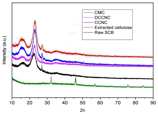 There was an additional peak at about 1312 cm−1 in extracted cellulose, and CCNC, but not in raw SCB. This peak is likely caused by C–H wagging, which happens when hydrogen bonds are broken []. The extracted cellulose had identical peak patterns as the raw SCB, but there was an extra peak around 1312 cm−1. However, no peaks were observed at 1508 and 1239 cm−1, but it did have higher peak intensity at 897 cm−1 between glucose units in cellulose, which means that the amorphous areas in cellulosic materials were removed [,].