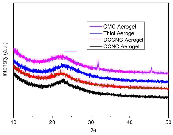 Figure 4 shows the XRD results for different types of functionalized cellulose nanocrystal (CNC) silica aerogels. Carboxylate CNC (CCNC) silica aerogel, double carboxylate CNC (DCCNC) silica aerogel, thiol-functionalized CCNC silica aerogel, and carboxymethyl cellulose (CMC) silica aerogel show how adding chemicals and silica changes the way their crystals look. The XRD pattern of the CCNC silica aerogel is dominated by a very broad hump centered around 2θ = 22°, which is characteristic of amorphous silica [,,,]. The characteristic crystalline peaks of cellulose I, which are visible in the pure CCNC material (Figure 4), are significantly suppressed and broadened in the aerogel composite. This indicates that the crystalline structure of the cellulose nanocrystals is largely masked by the overwhelming amorphous silica matrix. The persistence of a low-intensity, broad feature in the region of 22.5° suggests that some residual cellulose I crystallinity may be present, but the long-range order is greatly disrupted upon incorporation into the silica network. The peaks in DCCNC silica aerogels get wider and less intense, which means that the crystalline structure is more broken up [,]. Thiol-functionalized CCNC silica aerogels cause even more disruption, with peaks that are much wider and lower []. Most of the CMC silica aerogels are amorphous, with very weak cellulose peaks that show a lot of disruption. However, they still have broad peaks around 2θ = 20–30° from amorphous silica []. As the chemical modification and structural disruption increase, the Crystallinity Index (CI) goes down from CCNC to DCCNC to thiol-functionalized CCNC to CMC silica aerogels (Table 2). The peaks stay in the same places, which shows that the basic cellulose structure is still there. However, the heights and widths of these peaks change, showing that the crystallinity is different. These results are in line with what other studies have found about how chemical changes affect the crystalline structure of cellulose and how it interacts with silica [,,,,].