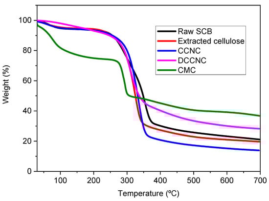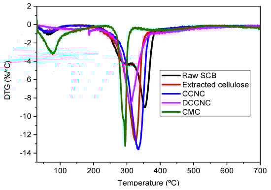 On the other hand, all the other materials that were studied showed two steps of degradation. The first one happened at about 100 °C, which meant that the moisture was evaporating. For extracted cellulose, the second step of degradation happened between 300 and 326 °C. For CCNC, it showed up between 310 and 334 °C, and for DCCNC, it showed up between 280 and 309 °C. This means that non-cellulosic materials were removed and that the thermal stability of the material was slowly decreasing compared to raw SCB []. These results point to less thermal stability during oxidation. For CMC, its TGA curve showed two steps of degradation at about 100 °C and 250–290 °C. This means that moisture was removed, and possibly carbon dioxide was released from the polymer chain [].
