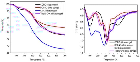 TGA was also used to study how adding silica to functionalized cellulose affects the thermal stability of cellulose-based silica aerogels. Figure 8 shows the TGA and DTG curves, respectively. The Thermogravimetric Analysis (TGA) of the CCNC-silica aerogel showed that the weight loss started at 100 °C, mostly because water evaporated. Then, around 260–310 °C, there was a second step of degradation that was caused by dehydration and the release of volatile compounds like carbon dioxide and acetic acid []. There was a third step of degradation between 400 and 453 °C, and the ash content was about 78% at 700 °C. The silica in the aerogels is the reason for the high ash content as compared to the functionalized cellulose ones. The DTG curves for the DCCNC and Thiol CCNC-silica aerogels reveal a more complex multi-peak profile, which provides insight into the different components and bonds within the composite. The peak around 230–250 °C, which is more pronounced in these aerogels, can be attributed to the thermal breakdown of the more labile, densely grafted carboxyl groups from citric acid treatment (in DCCNC) and the organosilane framework from MTMS (in Thiol-CCNC). Thiol groups (-SH) and the propyl chains of MTMS have different thermal stability compared to the cellulose backbone, leading to this distinct lower-temperature degradation event. The subsequent major peak (e.g., ~260–310 °C) corresponds to the main chain scission of the cellulose component, while the high-temperature event (>400 °C) is associated with the silica network, as seen in the CCNC-silica sample. The CMC-silica aerogel exhibited the lowest thermal stability among the composites, with three clear degradation steps and a final ash content of about 67% at 700 °C. This is consistent with the inherently lower thermal stability of the heavily modified, amorphous CMC polymer.