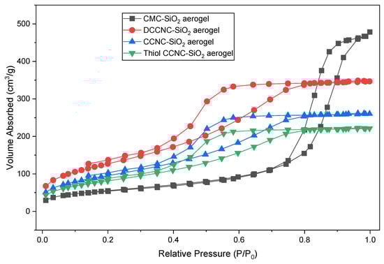 Nitrogen adsorption and desorption isotherms plots of functionalized cellulose-based silica aerogels.