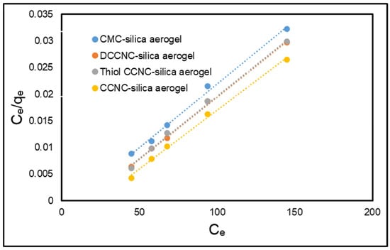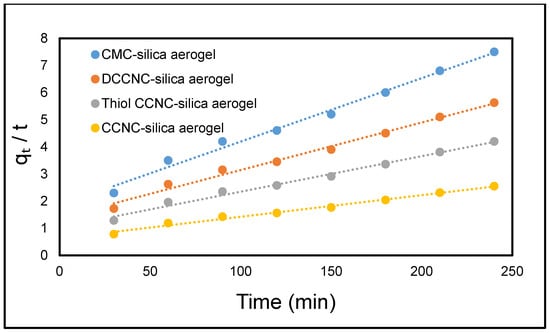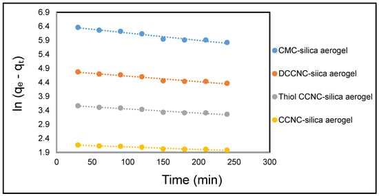 The nitrogen adsorption–desorption isotherms for CMC-SiO2, DCCNC-SiO2, CCNC-SiO2, and thiol-functionalized CCNC-SiO2 aerogels (Figure 9) show type IV isotherms with H3-type hysteresis loops. This is typical of mesoporous materials found in silica-based aerogels [,]. DCCNC-SiO2 had the highest specific surface area (446.86 m2/g) and the smallest average pore diameter (4.59 nm) of all the samples. This means that it has a lot of uniform mesopores that are close together. This could mean that there are more places for dye molecules to stick to the surface, but it could also mean that bigger dye molecules move more slowly. The surface area of CMC-SiO2 was smaller (195.06 m2/g), but the pore diameter was larger (14.33 nm), which made it easier for methylene blue to spread through the porous network more quickly. This matches its high adsorption capacity in Section 3.6.