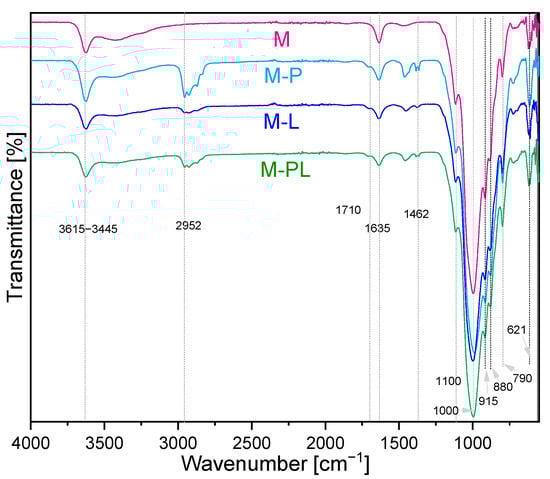 Figure 1 shows FTIR-ATR spectra of pristine sodium montmorillonite and its derivatives. The bands at 3615 cm−1 and 3445 cm−1 for all the samples are attributed to stretching vibrations, while the band at 1635 cm−1 is assigned to bending vibrations of -OH groups from water molecules []. The bands corresponding to the AlAlOH and AlMgOH bending vibrations are observed at 915 and 880 cm−1, respectively. A broad band at 1000 cm−1 is related to the stretching vibrations of the Si-O groups, while the bands at 790 cm−1 and 1100 cm−1 belong to asymmetric stretching vibrations or bending vibrations of Si-O-Si bonds [,]. The band at 621 cm−1 is assigned to the Al-O and Si-O couple from the plane vibrations []. It can be observed that the clay, after modification, differs from the pristine MMT. Spectra of the modified clays reveal additional absorption bands, absent from the pristine M, originating from the terpenes, confirming their presence in the aluminosilicate. The peaks at ca. 2952 cm−1 are assigned to -CH3 groups of pinene and limonene, and a small peak at 1462 cm−1 is assigned to the vibrations of the skeletal C-H bond of these groups. Additionally, geminal methyl groups (1384 and 1366 cm−1) [] can be noticed in samples with pinene. Peaks characterized for pinene in the M-P sample are clearly visible, which can indicate that terpene was also adsorbed at the MMT surface in a greater amount than limonene.
