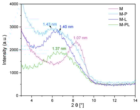 We can observe shifts in peaks for modified MMT toward lower angle values, indicating an increase in the aluminosilicate interlayer gallery (d-spacing) after treatment of the filler with the selected terpenes or their mixture (Figure 2). D-spacing of pristine clay is 1.07 nm (8.3°), and MMT with terpenes is in the range of 1.31–1.43 nm. The biggest shift was recorded for M-P. Although this phenomenon correlates with TGA results (Table 1) (the highest content of pinene in MMT), there is no significant difference between the two terpenes, despite the fact that P content is twice higher than L (Table 1). It may be related to an adsorption of some P molecules also on the clay surface. The smallest shift towards lower angle values was observed for M-PL. It can be related to the more complex structure of the mixture than the individual terpenes, which can lower its volatility and hinder the sorption between the MMT layers. Broadening of the space gallery of Na-MMT depends on the modification method and chemical composition of the modifier. Pure terpenes can broaden the space gallery more effectively than their mixtures in the form of essential oils via the solventless method, e.g., in work [], thyme, oregano, and basil EOs did not intercalate into Na-MMT (they adsorbed on the clay surface), and more effective intercalation was for already organophylized (with quaternary compounds) MMT [,]. Pure eugenol broadened the space gallery of MMT from 1.08 to 1.43 nm via the adsorption method [].
