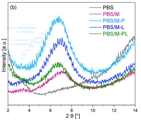 As seen in Figure 3a and Table 2, the addition of the filler slightly affected the PBS structure. The XRD patterns of PBS films exhibited diffraction peaks at 19.62, 21.92, 22.55, 26.12, 28.86, and 29.17°. The characteristic most pronounced peaks at 19.62, 21.92, 22.55, and 29.17° correspond to the diffractions from (020), (021) (110), and (111) planes, respectively [,]. Shifting of the two peaks with the highest intensity (PBS/M 19.62 and 22.55°) can be related to the shrinkage of the crystal lattice, probably caused by the occurrence of stacking faults interstitial or substitutional atoms and some residual stress in the absorbing layer, which can shift or broaden the peaks []. The peaks’ lower intensity can indicate the polymer’s intersection into the filler interlayer gallery [] and the lower crystallinity of the PBS. The peaks marked with lines 1 and 6 came from the filler. Figure 4b shows peaks at lower 2θ values assigned to the montmorillonite interlayer gallery in the polymer matrix (Figure 3b, line 1). The low intensity of these peaks results from the filler’s “dilution” effect in the polymeric matrix []. Compared with the pure fillers, it can be seen that the interlayer space increased only in the case of pristine sodium aluminosilicate (from 1.20 to 1.25 nm), whereas the d001-spacing for all modified MMT decreased (Table 2). It can result from the “squeezing” of the platelets and migration of trapped terpenes into the polyester matrix. Similar results were also observed in other works related to polymer composites with OMMT. In work [] d-spacing of MMT modified with dimeric surfactant and 4-decyloxyphenylacetamide shifted from 4.2° for their native form to 5.3° in the PBS matrix. The peak of MMT modified with cetyl trimethyl ammonium bromide (CTAB) indicates a high degree of intercalation (3.85°) after introduction into PBS shifted to 6.0° []. Bentonite modified with thymol and carvacrol that exhibited a d-spacing peak at 6.82° after addition into LDPE matrix shifted to 7.2° []. Moreover, in some works related to composites where two peaks for MMT can be observed, the first one with high intensity at low angle values related to the filler intercalation and broad but with low intensity at higher contact values (higher than pristine OMMT), indicating agglomeration of some fraction of introduced filler. This phenomenon was usually observed for the composites obtained via extrusion or injection molding, where higher temperature and high shear force were applied [,,,]. These changes can be caused by partial terpene evaporation induced by processing conditions. Lack of the shift towards low angle values indicates the formation of a conventional composite with the slight intercalated aluminosi-licate layers without their agglomeration, and not a nanocomposite [].