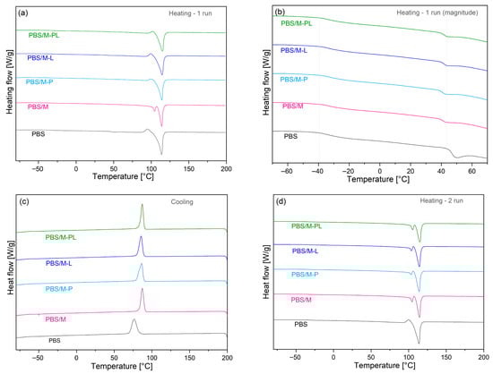 DSC thermograms for PBS and its composites. I heating (a), I heating (magnitude) (b), Cooling (c), II heating (d).