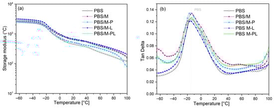 Dynamic thermal mechanical analysis was performed to study the viscoelastic properties of the composites. It can be noticed that storage modulus (E′) curves shown in Figure 5 for composites had higher values than those for pure PBS in the whole temperature range. An increase in E′ was also observed for PBS and PBSA films modified with OMMT [,,]. It is related to the reinforcing effect of rigid structures of inorganic fillers dispersed in the polymeric matrix and improved stiffness of the composite material, compared to the reference PBS. The drop of E′ at ca. −26 °C is similar for all the samples, which corresponds with the DSC results (first Tg-DMTA). The temperature of the maximum tanδ peak reflecting polymer chain movement for pure PBS (at ca. −9 °C) is shifted towards slightly lower temperatures for the composites, except for PBS/M and PBS/M-PL. This change can be an effect of the presence of terpene inside and on the surface of the filler and its intercalation. The exception for the sample containing the PL mixture can be related to the low content of the modifier in the hybrid filler. Usually, a simultaneous increase in the storage modulus with an increase in the relaxation temperature, interpreted as glass transition temperature, is interpreted as an effect indicating strong interactions between the filler and the polymeric matrix. Increased interactions between functional groups on the surface of the modified inorganic filler limit the mobility of polymer macromolecules in the interfacial region []. Based on the DMTA results, two separate mechanisms can be found among the analyzed materials. In the case of the PBS/M-P series, reduced values of both Tg-DMTA and E′were noted, which may be related to the more considerable amount of the non-bounded MMT low-molecular-weight modifier, which, after being dispersed in the polymeric matrix, showed a partial compatibilizing effect on PBS. This phenomenon can be related to the highest content of terpene in the modifier (Table 1). The remaining series were characterized by increased polymer–filler adhesion, further confirmed by the reduced tanδ value in the glass transition range compared to the PBS/M sample.