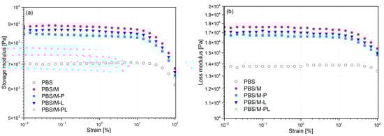 Oscillatory rheological results of strain-sweep experiments: Storage modulus (a), Loss modulus (b) conducted for PBS and its composites.
