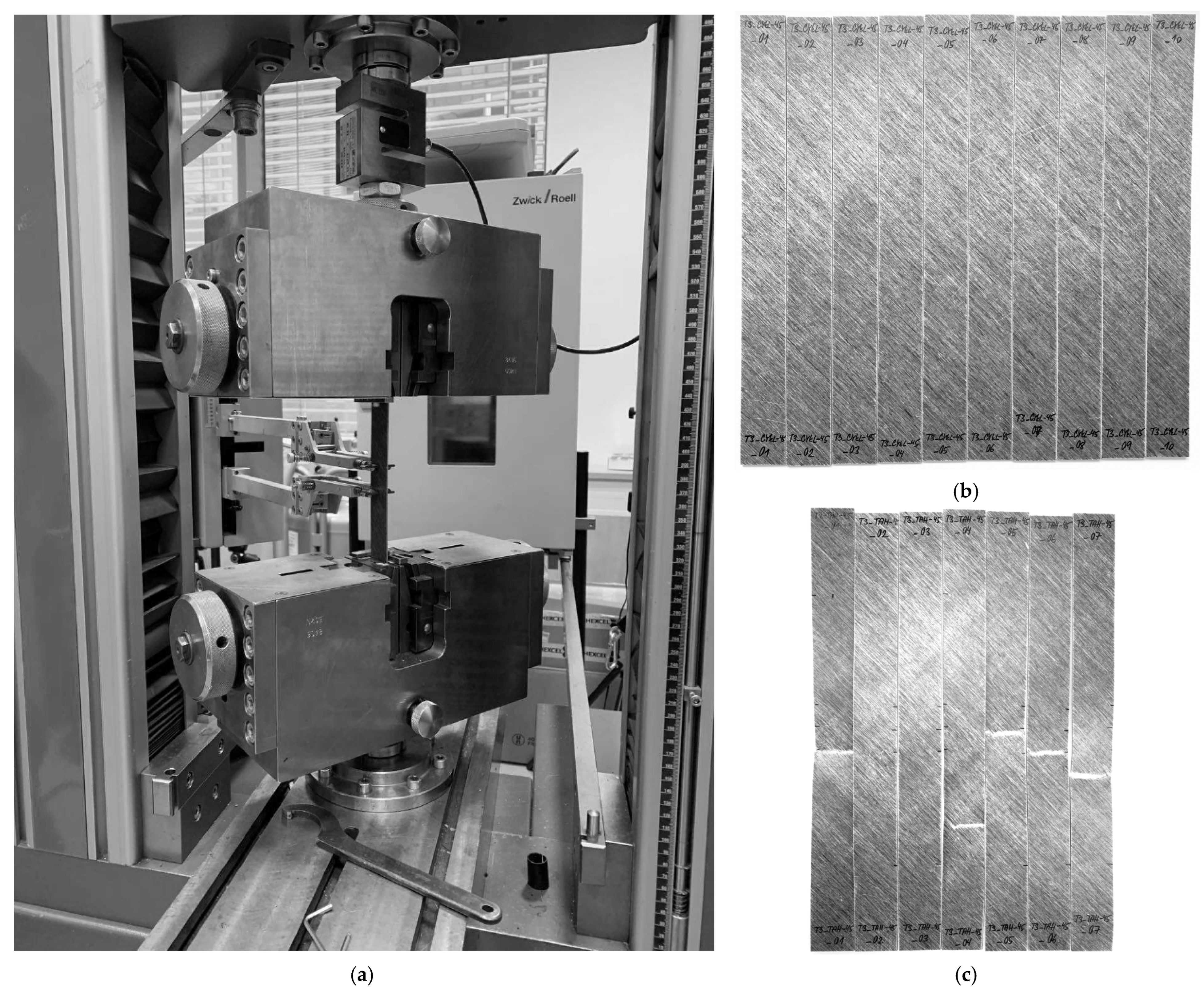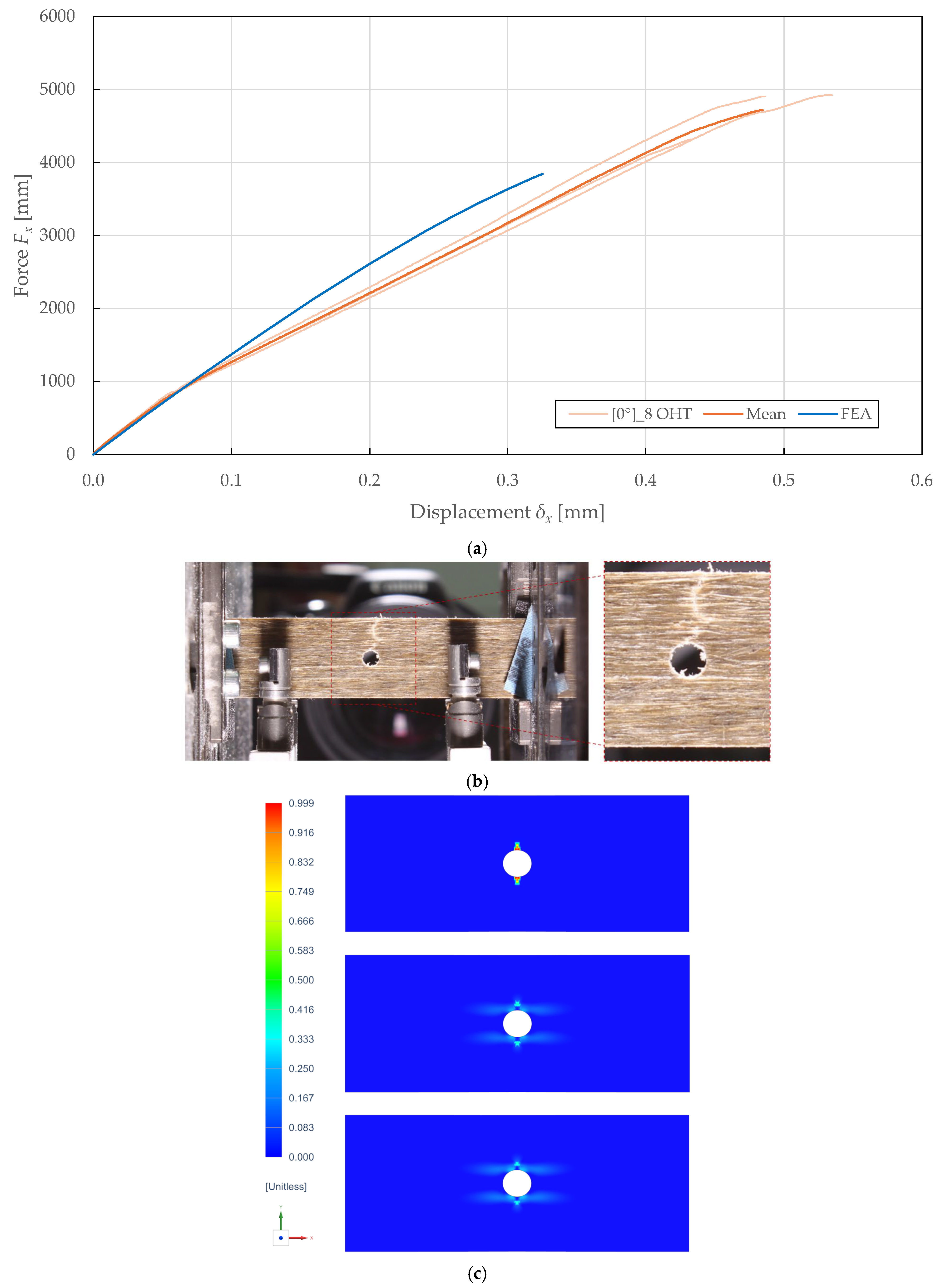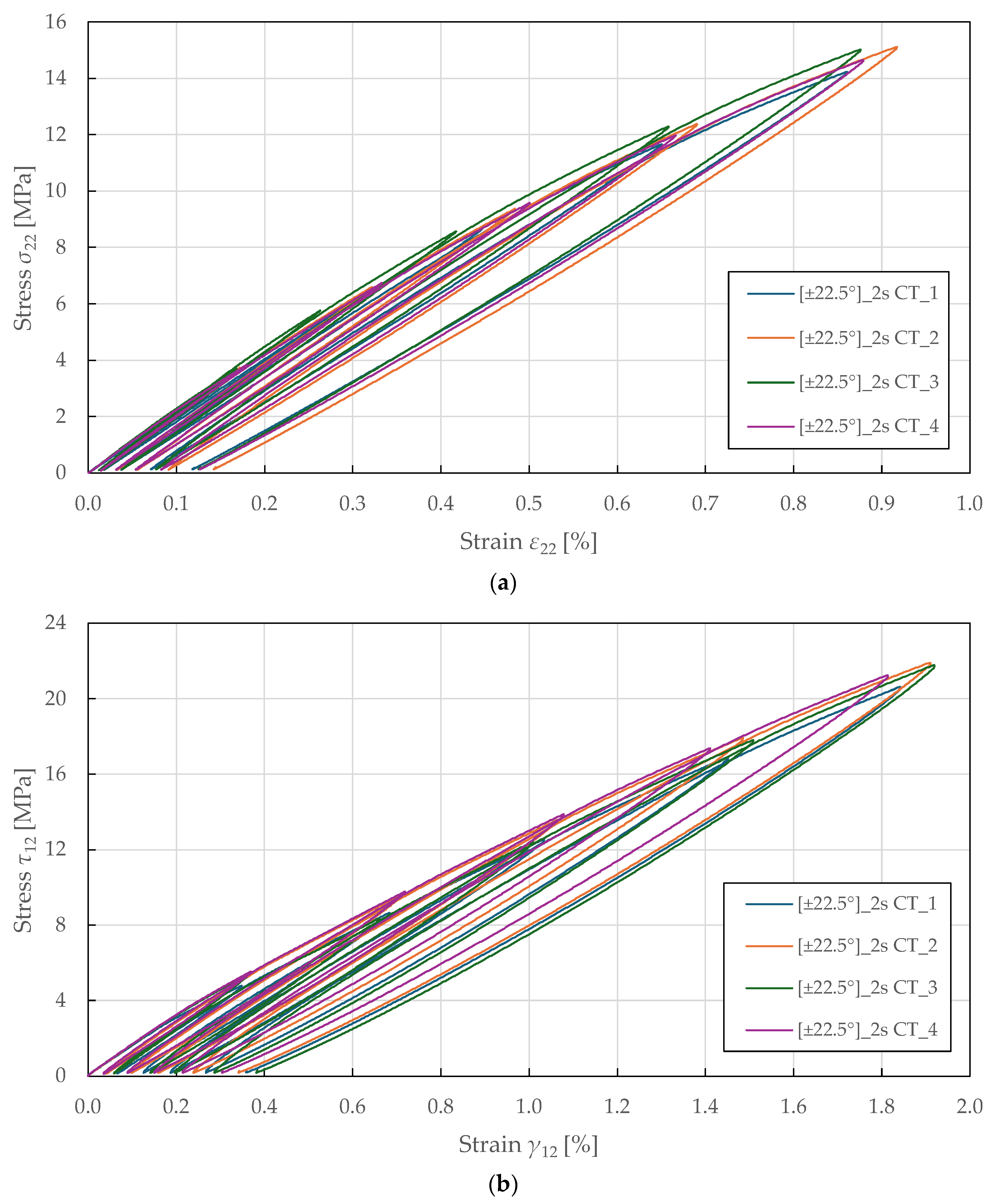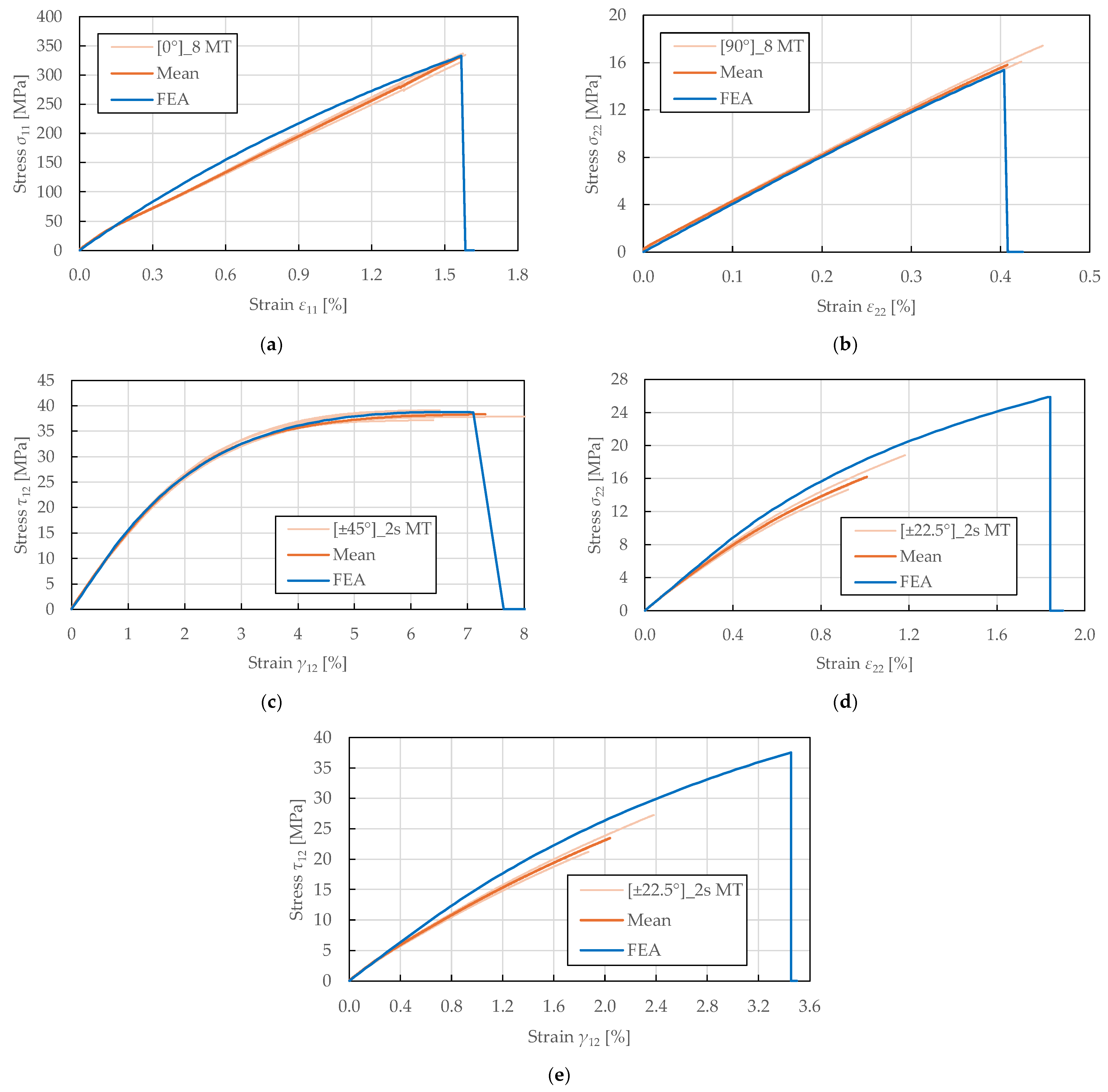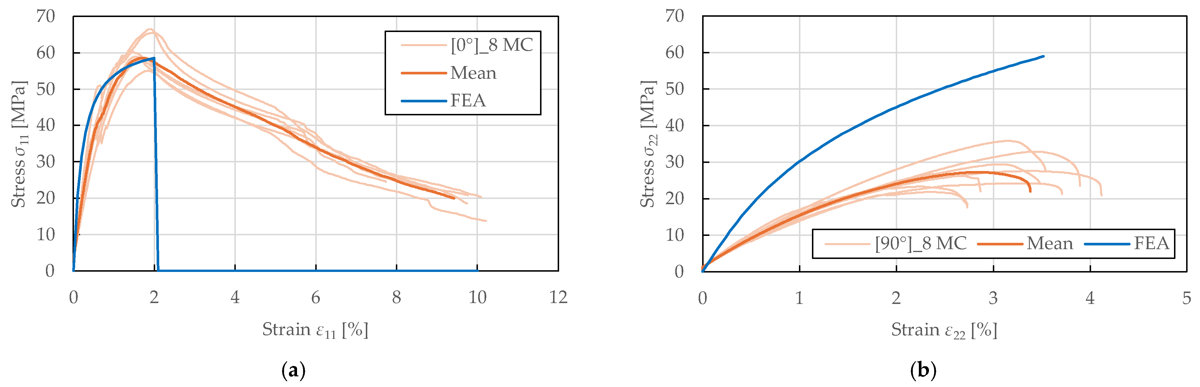 Figure 5, the obtained stress–strain curves exhibit a predominantly linear response up to failure. Starting at a stress and strain of 5 ± 1 MPa and 0.13 ± 0.02%, the responses deviate from the initial linearity, resulting in a slight loss of stiffness. The identified tensile transverse direction material properties for the CDM model are summarised in