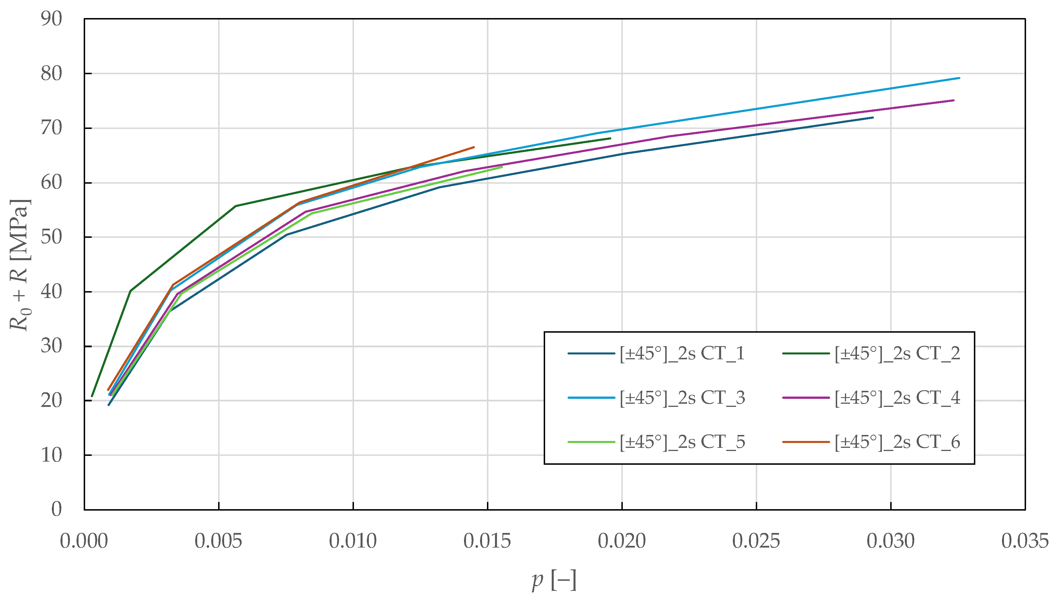 shear plasticity master curves are plotted. Then, LR (LSM) was used to fit the isotropic hardening power law in Equation (13) to the experimental data. The identified in-plane shear plasticity parameters for the CDM model are listed in