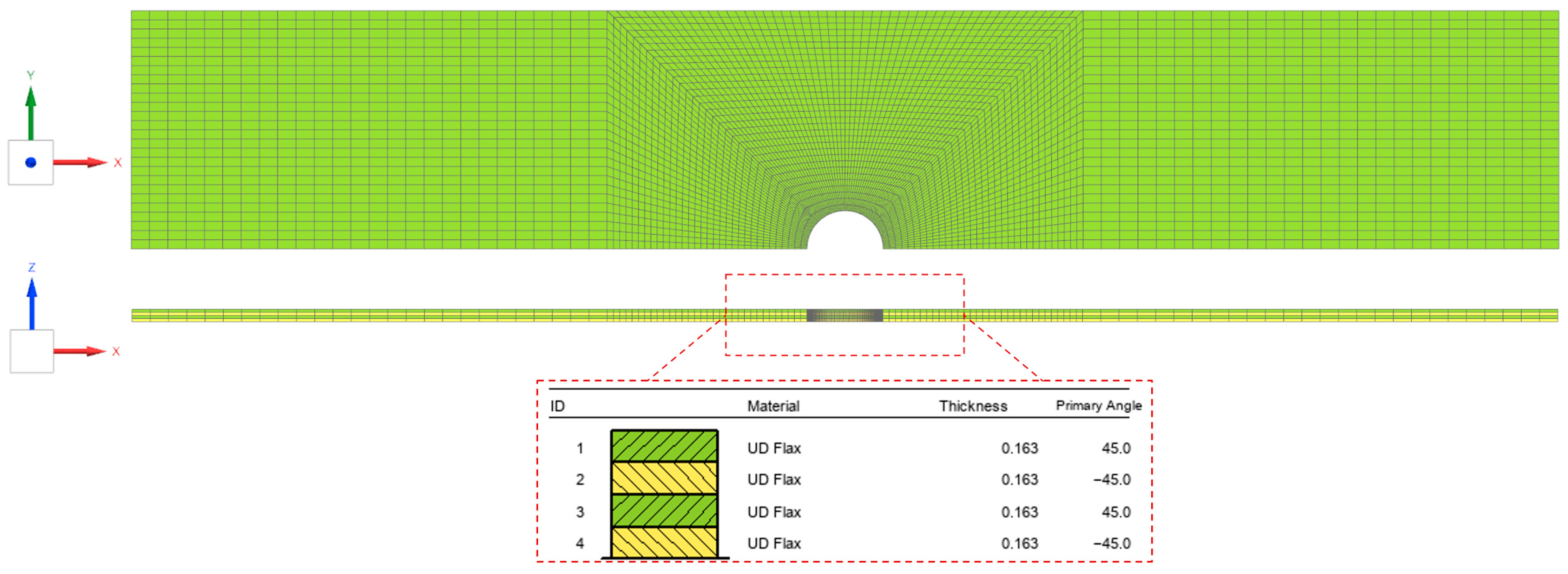 ) indicates strong coupling between longitudinal extension and transverse contraction. This high value of Poisson’s ratio (compared to typical values of 0.25–0.35 for synthetic fibre composites) may reflect the complex deformation mechanisms of flax fibres, including microstructural rearrangement and matrix plastic flow. The biaxial extensometer was unclipped at a longitudinal and transverse strain of 1.32 ± 0.05% and 0.57 ± 0.03%, respectively, to avoid damaging it, well before ultimate failure at 1.56 ± 0.06%. This confirms that the linear strain relationship is maintained throughout the majority of the loading history. The identified tensile fibre-direction material properties for the CDM model are summarised in